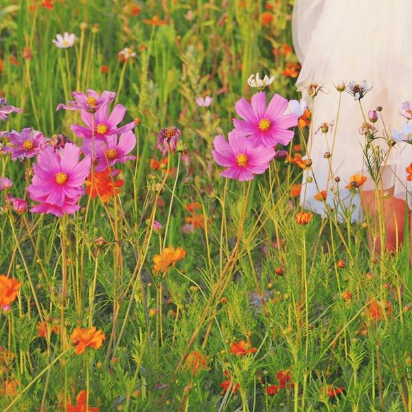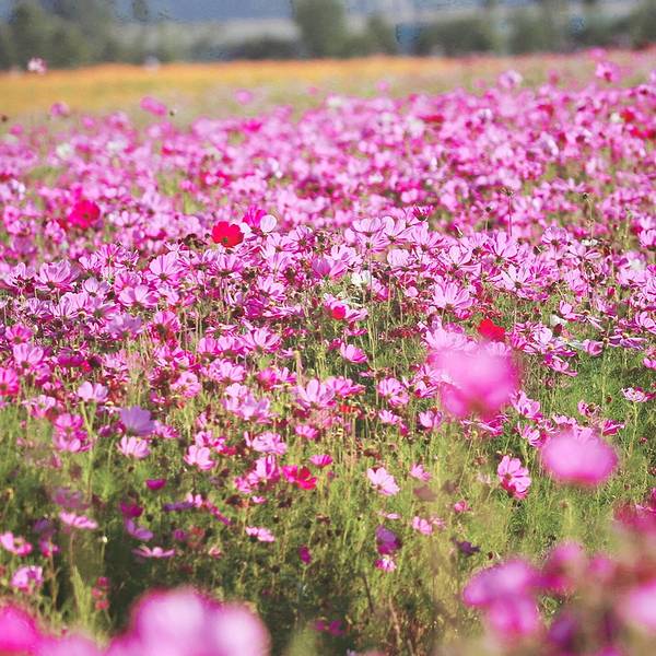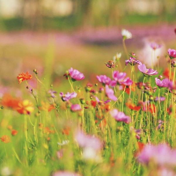 一片空旷的土地上盛开着成片的花,串成了一片一片花海。百花齐放,不知所以,只觉得静静站着也是享受。最好天气风和日丽,微风凉爽,支一架吊床躺在花丛间那才是极美的一件事。