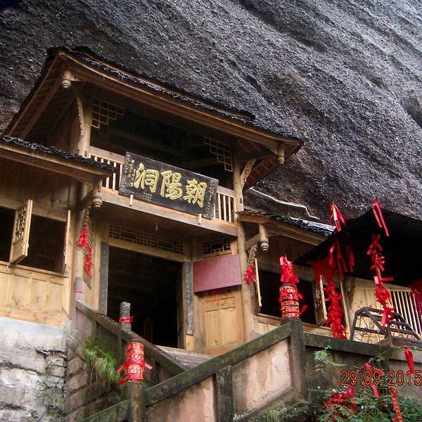 朝阳洞的门楼依山就势而建,完全与山形融为一体,崖壁非常陡峭,洞外的古银杏非常高大,在山路向上望,仅一条缝隙能够看到天空;秋天的朝阳洞外银杏叶金黄,与崖壁、树上的红色福带和门楼一起更是秀美。朝阳洞内供奉的是宁封真君及吕祖、邱祖神像,在明末的时候损毁,清代重建;而今的朝阳洞也经过翻修,更是俏丽。朝阳洞不大,洞外的风景很美,可以在这个景点游玩、休息0.5~1小时左右。