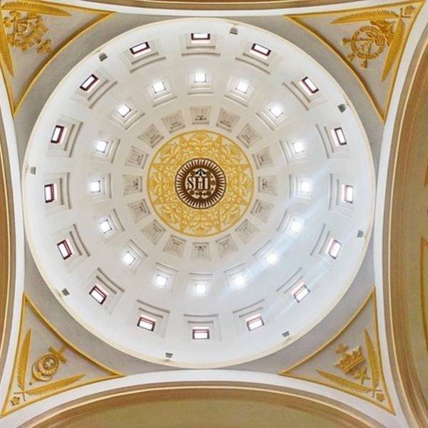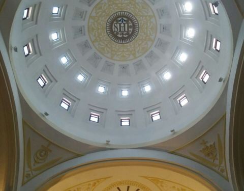 教堂内正中的半球型白色拱顶,配着黄色的花纹图案装饰