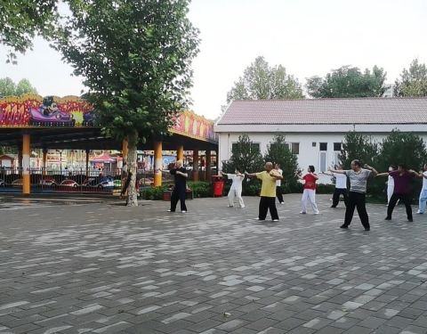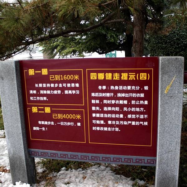 公园里有标志,鼓励人们多运动,多散步,所以走了多远,路边就有牌子标明了,这样走两圈下来多远,心里也能有个数,我觉得这一点非常好,非常人性化。所以很多老人喜欢在这里玩,还有人免费教老人们打太极拳。