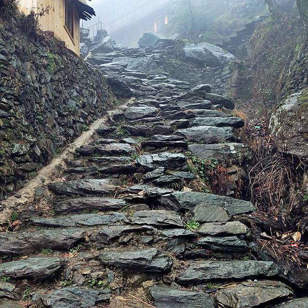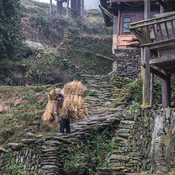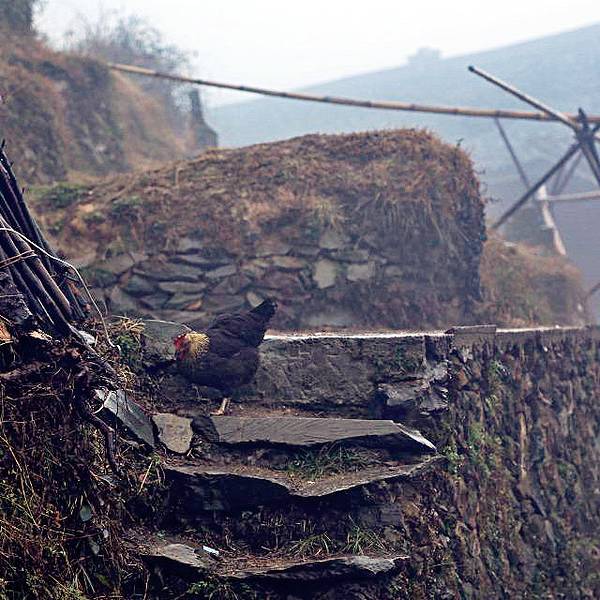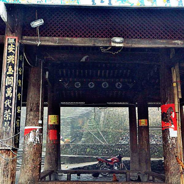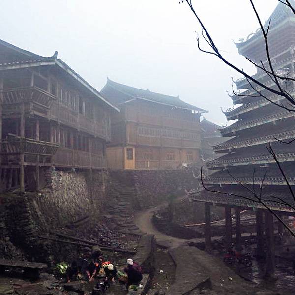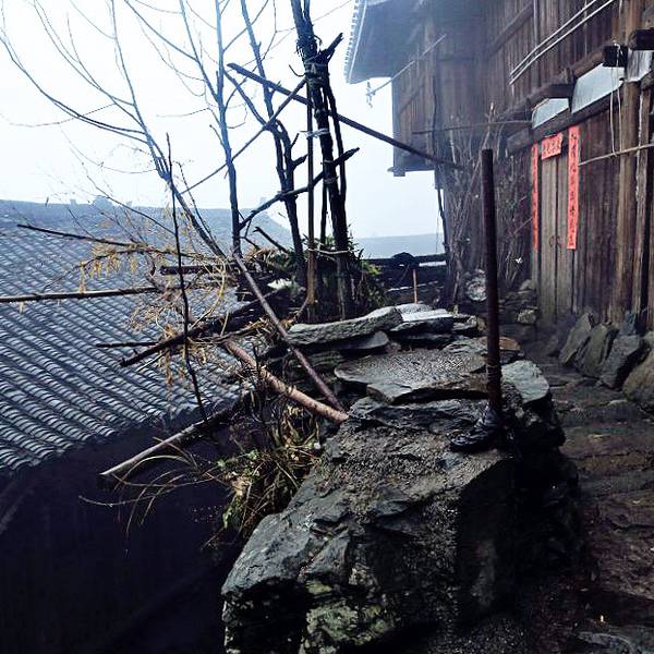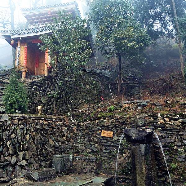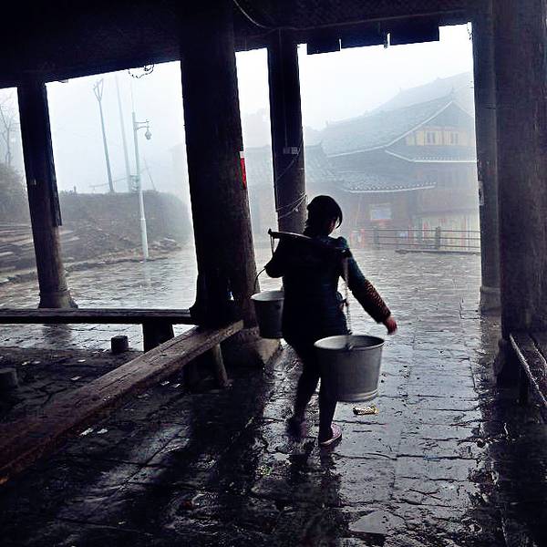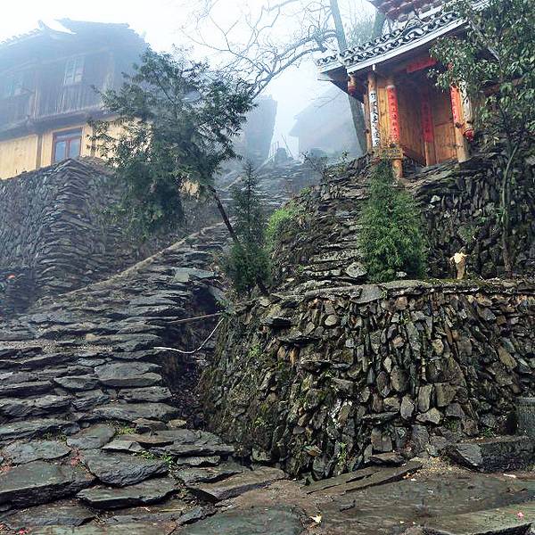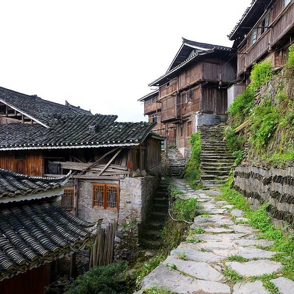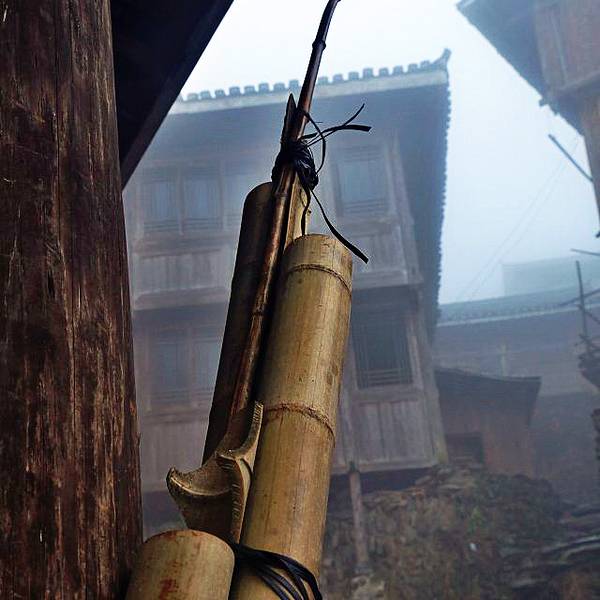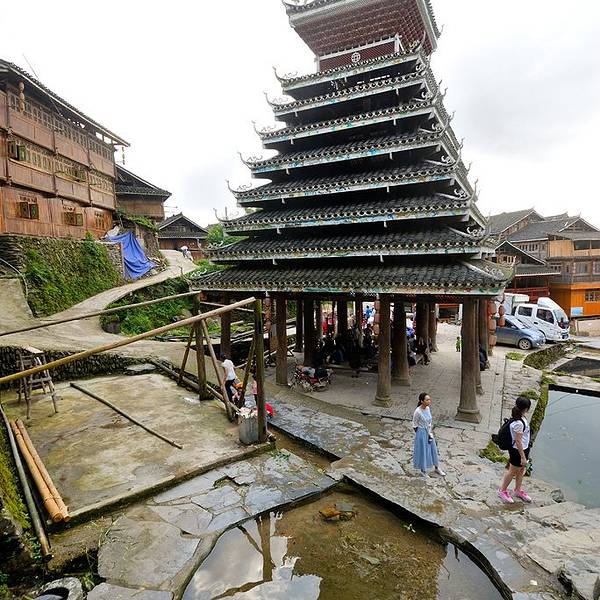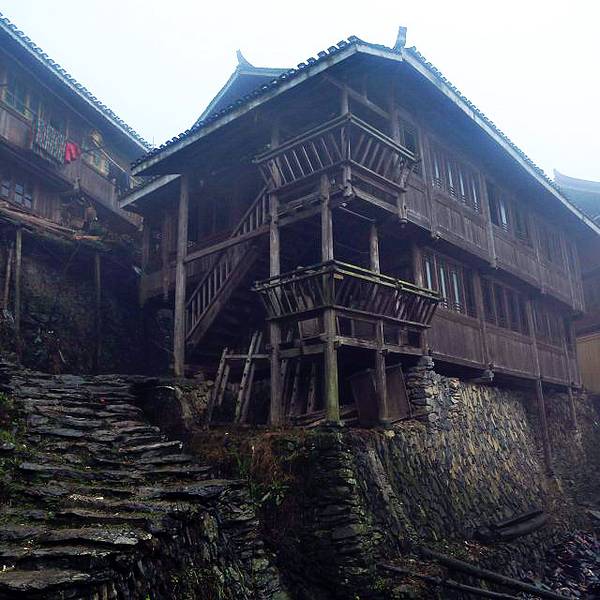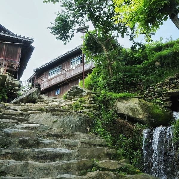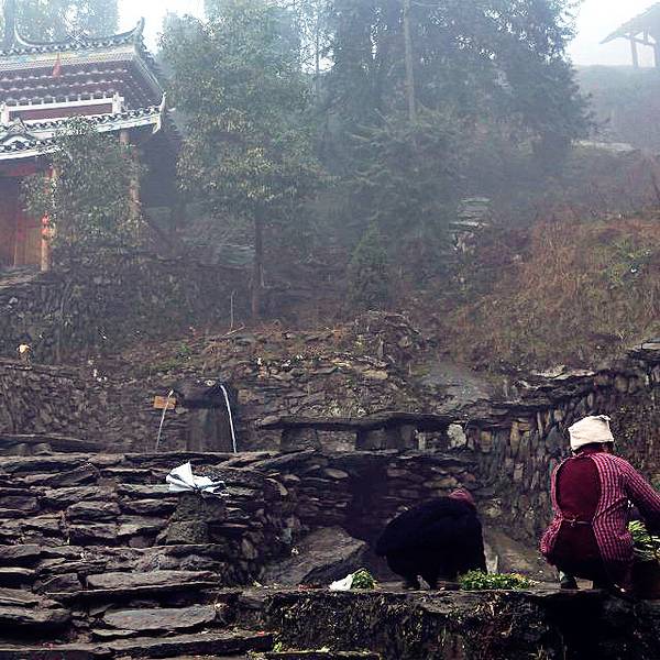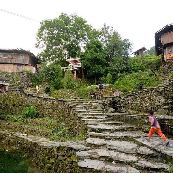 经鼓楼继续向山行就会见到那坎坡上从山上流下来的清泉,聪明的寨民在泉水流下来的地方立了个用青石打造的石斗,山泉直接流进斗中,然后再从左右凹槽流到下面砌成的水池,当地人把这称之为瓢井。早上的井边池旁三三两两都是些挑水洗衣的寨民,据说此泉甘甜润口,远近闻名,多少年经流不息,是古寨的生活之源。大山之上水源难觅,无水则无寨,在此高山之地能得此良泉也算是古寨之幸吧。过了山泉,眼前的石板路徒然增高,大小不一的青石块镶进坡土砌成上山的路,看似高低不平走起来倒也踏实。想到寨民们长年累月就是在此山道上奔波劳累,不由我们感概一番。山道旁多为悬空吊脚楼,以三层开间为主,外貌格式一如其他侗寨建筑风格,只是多属陈年模样。我们顺着山径漫游,脚下的青石板路似乎长无止境,走哪通哪,寨中沿途随处可见禾晒木架、水碾、石碾、谷仓,还有井亭、鱼塘、萨堂以及侗寨必不可少的风雨桥。这些东西无一不是农耕文明的产物,也都是与寨民生活息息相关之物,无不渗透着侗族人的精神与智慧,走一路就相当于欣赏了一遍侗族文化与风情。