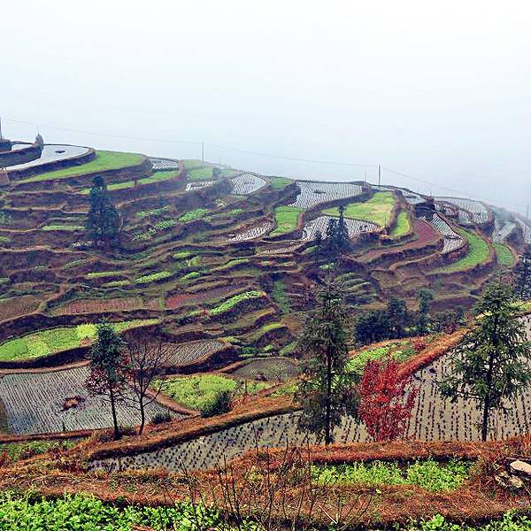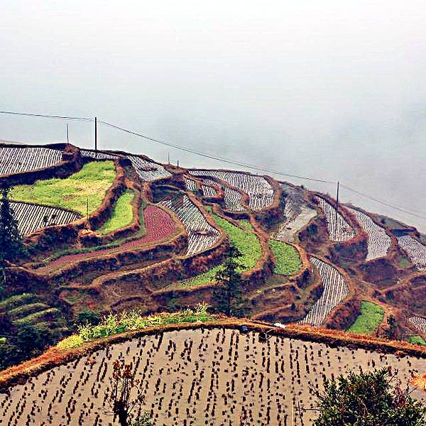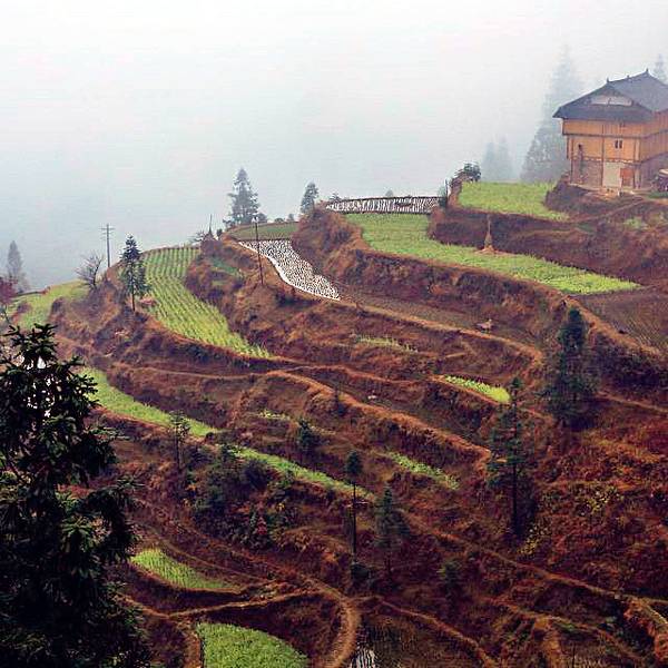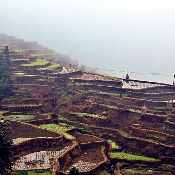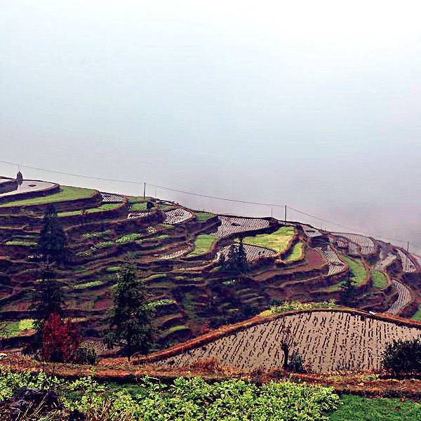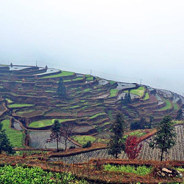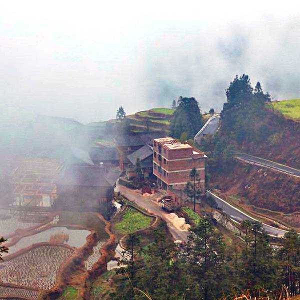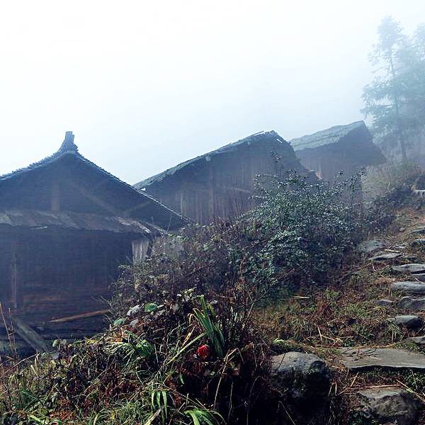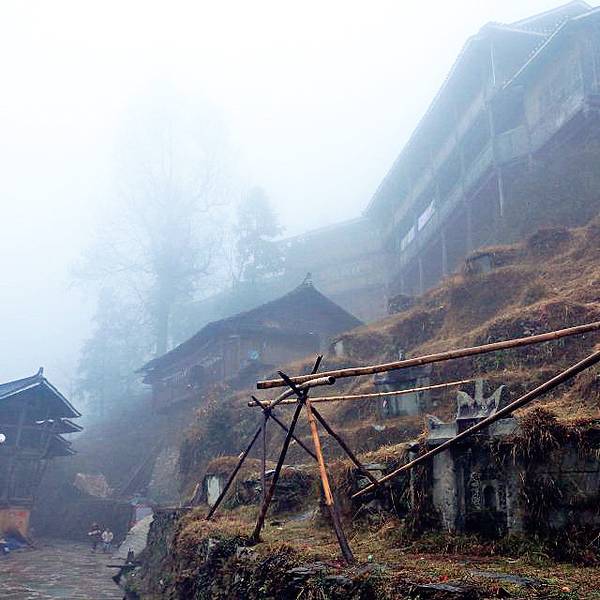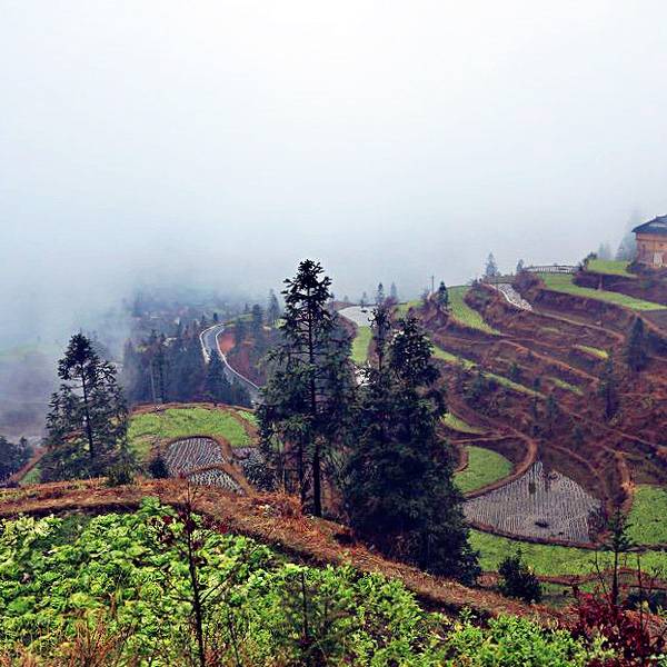 天公亦作美。我们一到寨口,本来一路密雨浓雾的天气正好开眼。云雾散开,正好露出寨口旁边山谷中的层层梯田。我们站在寨口所在的高坡望去,云里雾里的大山谷中若隐若现的全都是星罗棋布的梯田。无论是高坡低沟还是平坎斜地,云雾散处尽见梯田。这些梯田形状大小各异,高低远近不同,虽然它们的面积都不大,然而聚拢起来其势难挡。只见这些梯田层层叠叠、密密麻麻、级级相连地沿着山势布满着座座山坡。放眼一望,这万倾良田真可谓规模宏大,大气磅礴,气势恢宏。令人惊叹的是在茫茫云雾中,依稀可见那些洒落在山谷梯田间的吊脚楼,像孤岛浮于云海,又似繁星点缀夜空。吊脚楼与梯田互映,山寨与天地交融,人与自然和谐相处,置身其间,一时仿若仙境。山上风云多变,我们仍在陶醉之时,不知不觉又被突如其来的云雾裹进了一片混沌之中。无奈我们只能舍弃美景,继续前行。