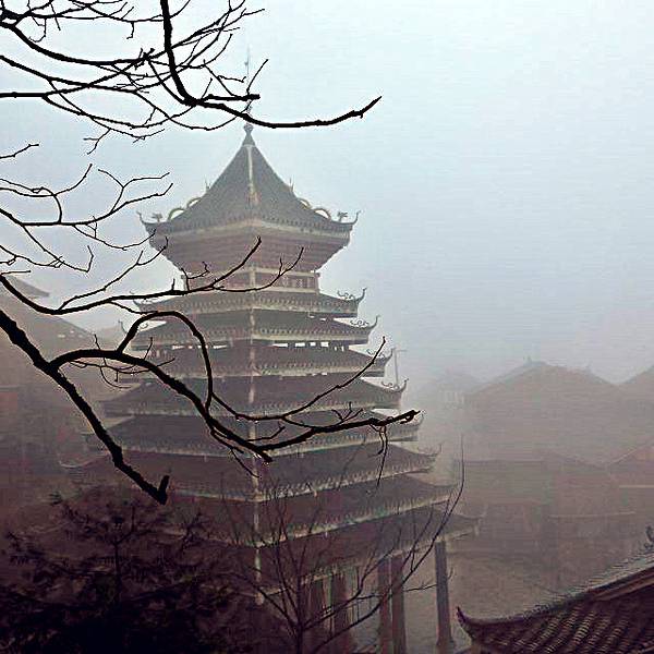 我们沿路信步走进古寨。堂安侗寨可以说是一个名副其实的山寨,它本身就处在大山高坡之处,周围三面环山,一面开向山谷,谷中梯田万倾,云遮雾罩,气象万千。走到寨中,首先就见到广场中央的那座代表着侗族吉祥物的高大鼓楼,高高的鼓楼宝顶直接苍天。鼓楼内地面上的炉火仍没有熄灭,早晨的围椅上空无一人,旁边还摆放着好些长短大小不一的芦笙,似乎昨夜寨民们曾在此狂欢过。鼓楼前是一块大空地,据说这就是歌坪,也是寨民们平时载歌载舞、欢歌笑语庆祝节日的场所,更是展示侗族文化中特有的侗族大歌这个非物质文化遗产的地方。鼓楼旁隔着水池就是一座侗寨戏楼,侗戏也是侗族人喜爱的传统民间艺术。高高的戏台立在水池之上,可以想象寨中唱侗戏时的那种万人空巷的热闹场景。代表着侗族传统文化和特征的戏台、歌坪与鼓楼这三项集中于一地,我们也只有在堂安这个侗寨见到,是不是这里的寨民更喜欢热闹或更加快乐就不得而知了。