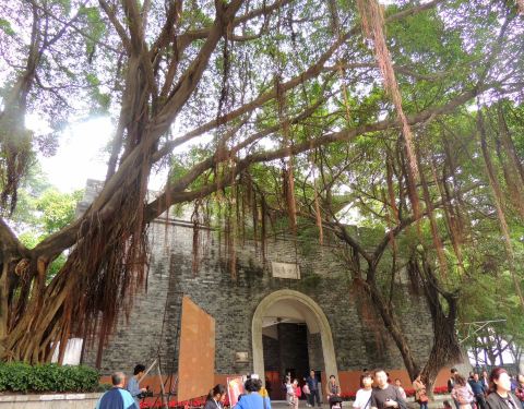 在越秀公园近中山纪念堂的门外不远,专门有个公交站的。是广州比较有年头的一个道观,仅从山门外那几棵古树就能体会到。做为道观来讲,不算很小,但依旧不能与现在很多佛寺的规模比,里面的香火很旺。马路对面就是越王井。