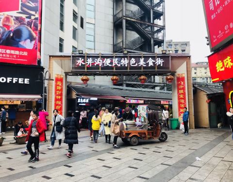 非常热闹,报恩塔旁边紧挨着就是水井沟商业步行街,步行街很短,还有美食街也都在这里,美食街很小,...