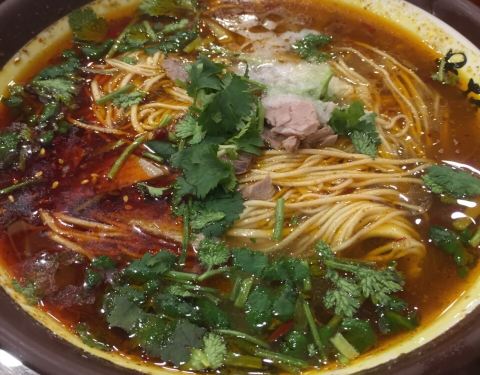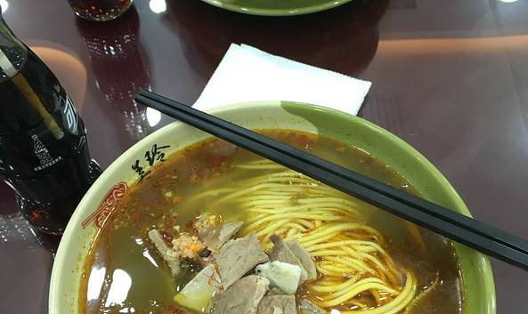 人还是一如既往的很多,支付方式微信不行,只可以现金或者支付宝,外卖需要一块钱餐盒费用,店内装修的很明亮开阔,座位挺多的,但是赶上高峰期有可能需要等位。 【美玲拉面】招牌面,清汤也会有些许辣味和咖喱味道,量很大,女生一大碗根本吃不了,可以提前跟师傅说面条可以选择毛细,酱料自己加【牛肉炒面】同样量也不少,酱油味道十足,适合重口味食用,面条特别劲道,味道很不错。其他小菜也同样好评,例如炸豆腐等。
