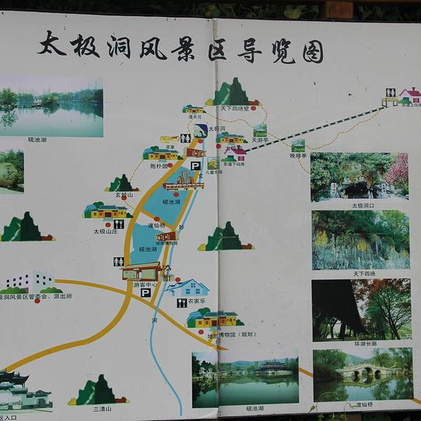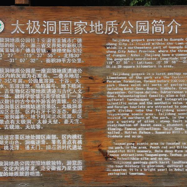 该景点位于安徽、江苏、浙江三省交界处的石龙山内,虽属于宣城,但是离以竹海、溶洞闻名的宜兴很近,仅有35公里路程。若在皖南想观赏溶洞,那么这里是很好的选择,明代冯梦龙曾把“广德埋藏(太极洞)、、钱塘江潮、雷州换鼓、海市蜃楼”称为天下四绝。洞内冬暖夏凉,钟乳石千姿百态,有旱洞、水洞之分,可以步行游览,也可以乘船探秘地下暗河。 景区的大门在南边,进入后先看到砚池湖,沿路分布着一些小景点,如果到得早,建议先直奔深处的太极洞,以免和旅游团的大队人马挤在一块,小景点出来再看。到达洞口后可以稍等一会,当游客人数聚集到20人左右,景区会分派免费的导游带领进洞。洞内游览路线呈Y字形,先玩左支路的旱洞,然后回到洞口,再玩右支路的水洞,出口在水洞。 经过洞口的长乐宫(两仪宫),先到达八景宫,钟乳石太上老君、千年槐荫值得观赏,滴水穿石妙不可言,状如卧兔的石头中间,竟被水滴打磨出了一个光滑的小孔。穿过铜关洞门,来到云境宫,“跫然岩”三字为范仲淹所题,仙舟覆挂是洞顶一块长近百米的的巨石。继续前行到珍宝宫(雪窦宫),钟乳石凌霄双塔、倒挂灵芝惟妙惟肖,埋藏峪深不可测,但是无路可走,旱洞的游览到此为止。 接着去水洞,原路返回洞口后再走几步就到渡口,九曲银河(八曲瀛洲)是地下暗河,游船免费,初次体验洞中坐船的游客会觉得很新奇,船只摇摇晃晃,时不时需要弯腰低头躲避撞到眼前的山岩。上岸后爬几十级台阶,即到玉皇宫(玉琼宫),该宫美丽的钟乳石是高2米多的一柱擎天(金龙盘玉柱)。 后面的海天宫(神醉宫)有整个溶洞较为特别的钟乳石群洞中黄山,洞顶倾斜,洞底长出怪石奇峰,黄山拥有的西海群峰、仙女峰在此都能看到,洞内灯光甚至营造出了黄山日出的景象,在高处的观景台上,可以欣赏洞中黄山的全景。再往后看过万象洞的钟如石群万象揽胜,仙源宫石壁上像什么全靠想象的壁画,水洞的游览就结束了。 从仙源宫到出口要在狭长的通道中向上攀爬800级台阶,令人垂头丧气。到达洞口后有索道坐,是敞开式的座椅,比较刺激,25元,只能下行,不过索道不是很有必要坐,因为步行下山也仅需十几分钟。下山时可以绕去看看写着“天下四绝”的天下四绝壁,然后途经已不开放的溶洞壶天宫,回到山下洞口的道观太极观。一般只游览太极洞的话需要2个小时。 如果时间有余,那么你还可以去参观距洞口不远的抱朴园,里面有古色古香的建筑和葱郁的植被。带小孩的游客,不妨去儿童乐园玩玩秋千、绳网桥,或者付费坐坐砚池湖上的游船。在去往景区大门的中途,有一座不高的玄妙山,那里能看到低矮的太湖石组成的石林。