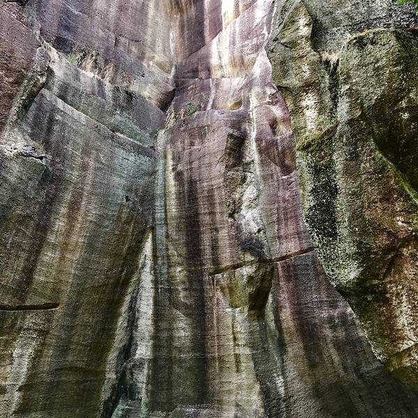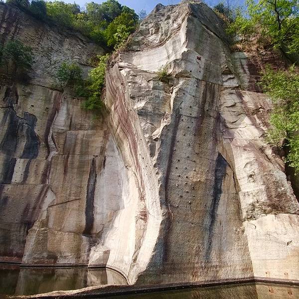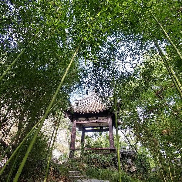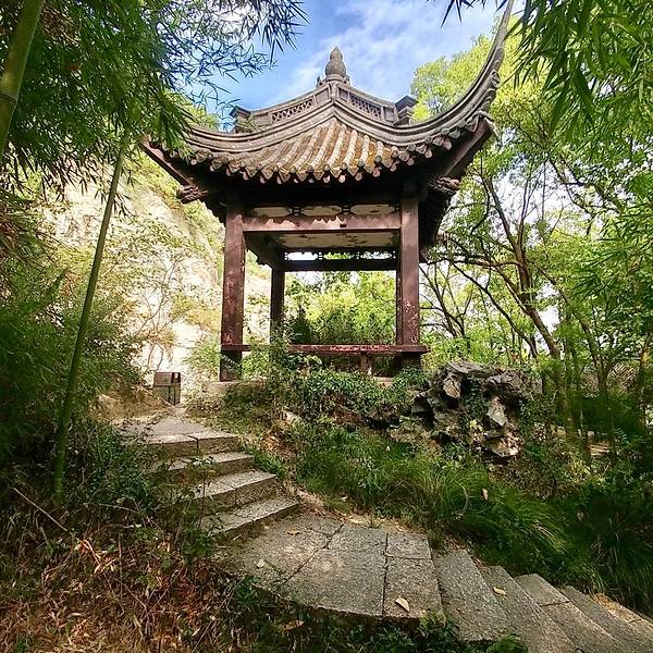 林子旁边还有石壁观赏区,靠着围栏可以一观这千年采石场留下的鬼斧神工,石头纹路被斧劈刀凿后大开大合,揉合着诸般色彩,变换莫测犹如一幅酣畅淋漓的草书!旁边有一处小山丘,遍植竹林,内中还有个小亭,趁着天光正好,我上去游览了一番。