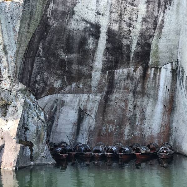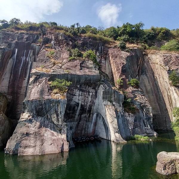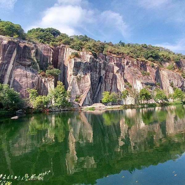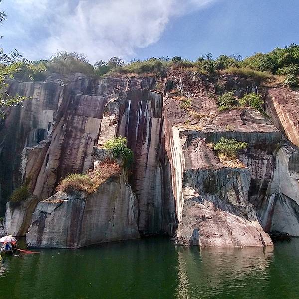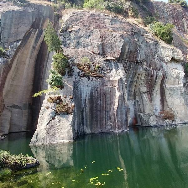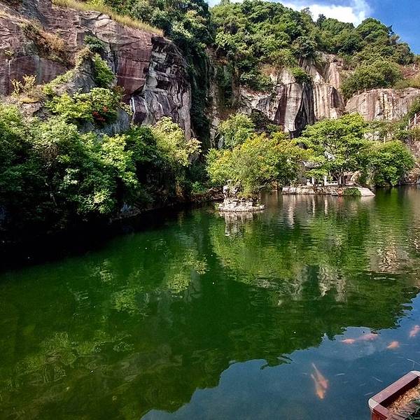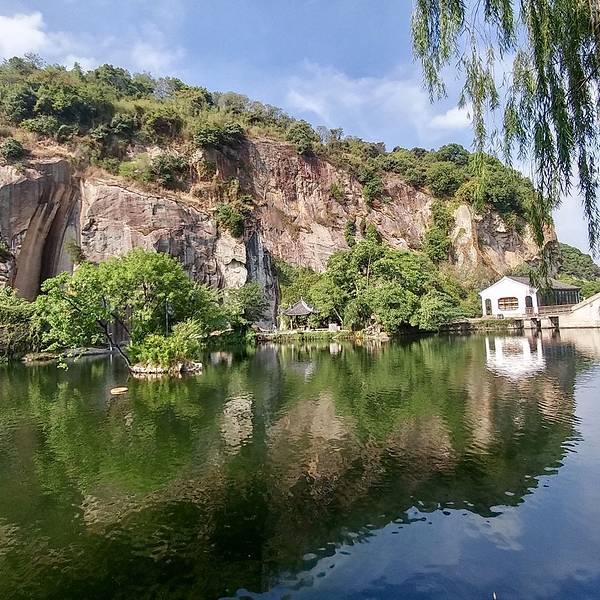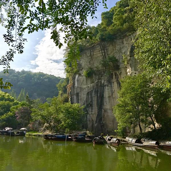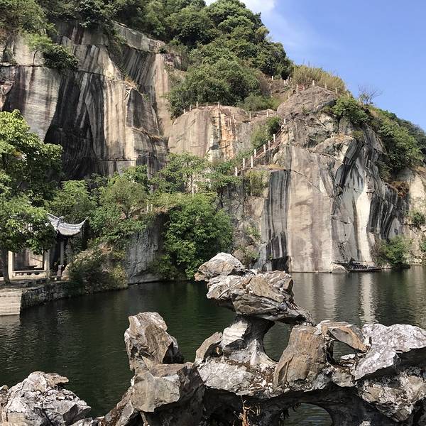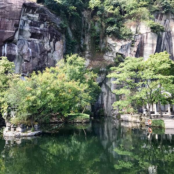 刚才说东湖其实就是古代的采石场!东湖所在地,原为一座青石山,秦始皇东巡时曾在此驻驾饮马,故被称为箬篑山。汉代以后,箬篑山成了绍兴的一处石料场,经过千百年的凿穿斧削,又是采用特殊的取石方法,搬走了半座青山,并形成了高达50多米的悬崖峭壁。取石还普遍深入到地下20多米,有的甚至四五十米处,日子一久,形成了长过200米,宽约80米的清水塘。清末,绍兴著名乡贤陶浚宣眼光独到,利用采石场筑起围墙,对水面稍加拓宽,遂成山水相映的东湖。