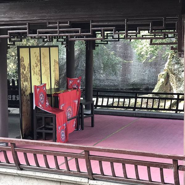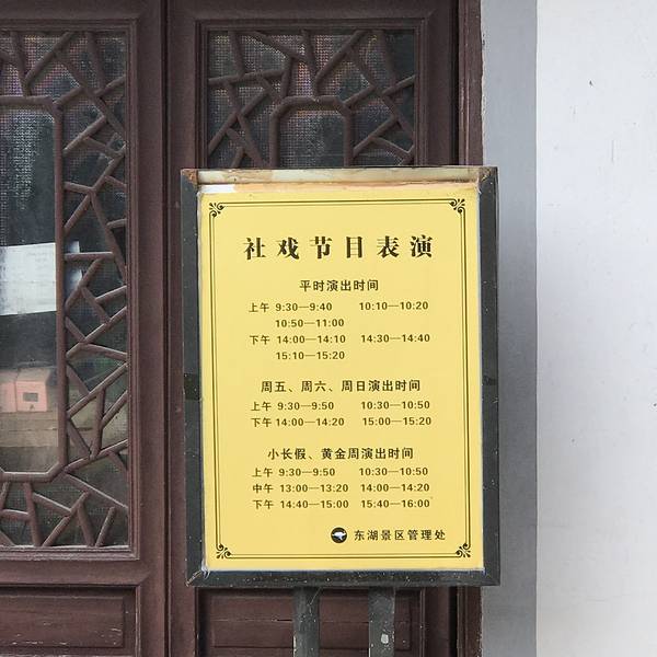 霞川桥是板墩板桥式样,两条桥墩把湖水分隔成三段,倒影映出个川字,背靠青绿山水,浑然天成!走到另一端尽头,回头望,山水通透!这一段除了乌篷船码头,还有几个亭子,配合山水成了绝佳的园林景观!最妙的是这里还有个社戏戏台,演出时间表如下我凭亭望了一阵风景,演员就出来了,清悦的嗓音在湖面上飘扬开来!