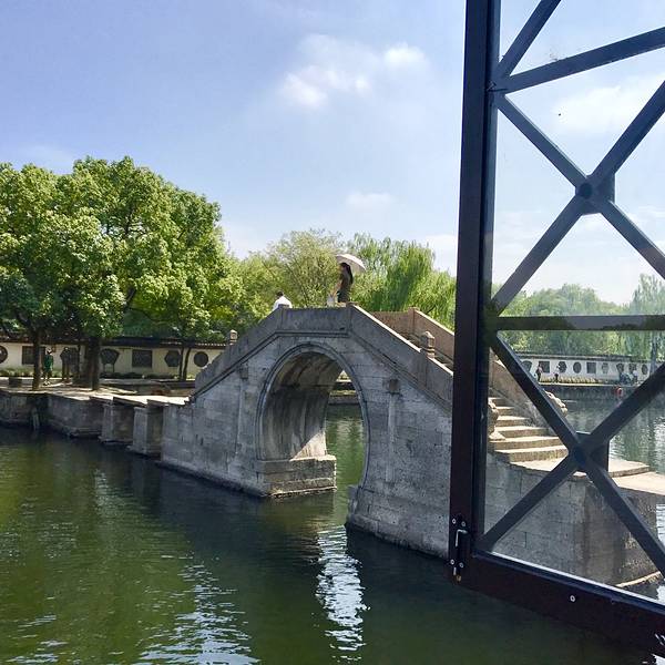 第一座是秦桥,因始皇在此喂马得名,南北首各构三孔平桥,中间是14级台阶形如满月的拱桥,乌篷船从拱桥下穿梭别有生趣!过得桥来,对面是半城书屋,推窗望桥,低头看书,临水品茶感觉不错。窗子里都是景!继续往前走,可以看到另一座桥,名字很美 霞川桥!