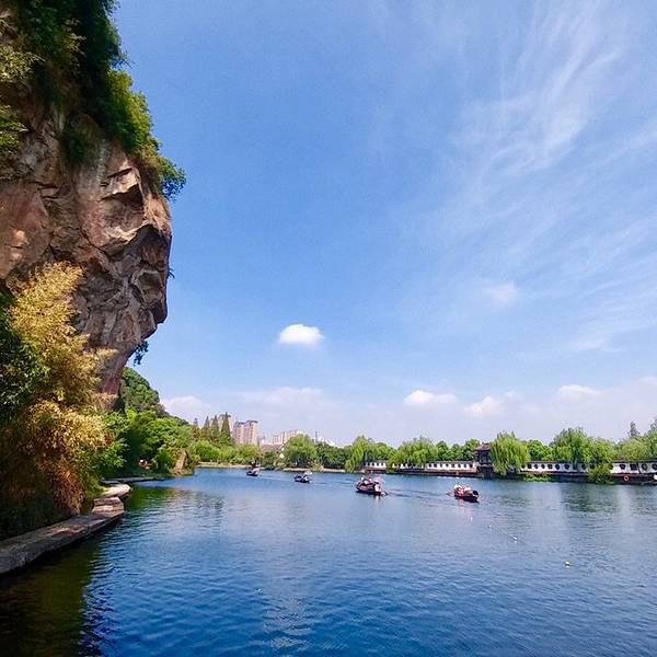 一进门,嗯,觉得景色不错,不过还是限于比较漂亮的免费公园级别!绕过小径,过了揽月桥基本就进入景点了,桥上望了一眼,一弯碧水,不禁眼前一亮!桥栏上的白菜花纹好特别!下桥后一拐弯,然后就一幅绝壁蜿蜒展开,映入眼帘,下面绕着的水面上排着若干乌篷船,突然有种景区自动升级vip的感觉!那座小石桥忍不住去走了一个来回!东湖的景区其实就是一狭长的水域背靠着山壁,水域的两头都有乌篷船售票点,85元一条船,最多可以坐三人,包括怀抱的小孩,所以如果一人单独前往还是在售票口找人凑在一起比较划算!