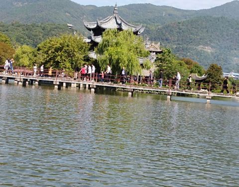 原本以为人工开凿的景点难以和自然形成的鬼斧神工媲美,可是看到嶙峋的绝壁在眼前徐徐展开,再配上碧绿的湖水,简直是一副山水长卷,而且移步换景,美不胜收!青山绿水当有桥,东湖上有好几座桥都各有特色!