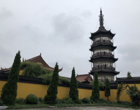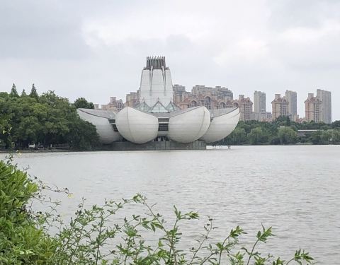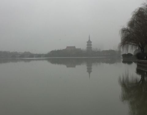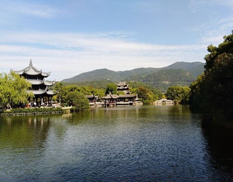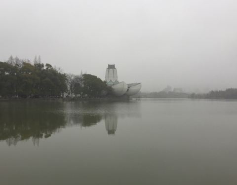 在“老平湖”等位时跑过来转一圈。 李叔同纪念馆的外形十分别致。 由于下着雨,湖面上烟雨蒙蒙。有数只鸟儿飞过,惹人遐思。犹如水墨画效果。 天晴时这种感觉就没了。