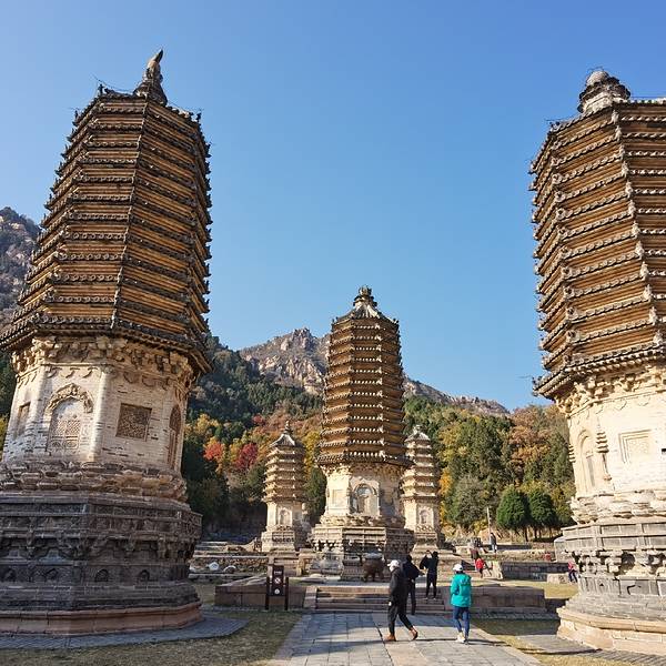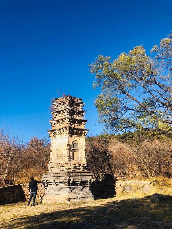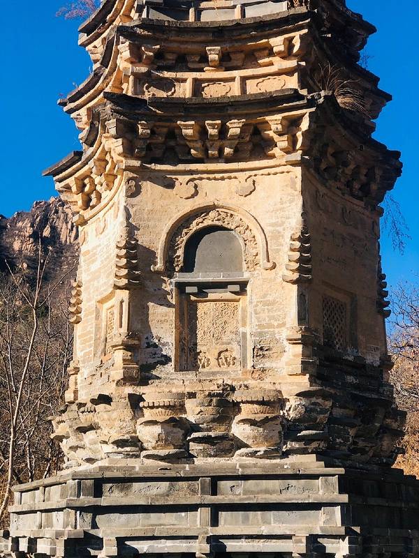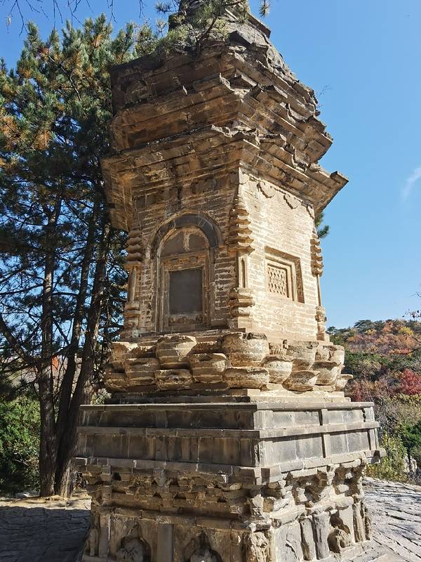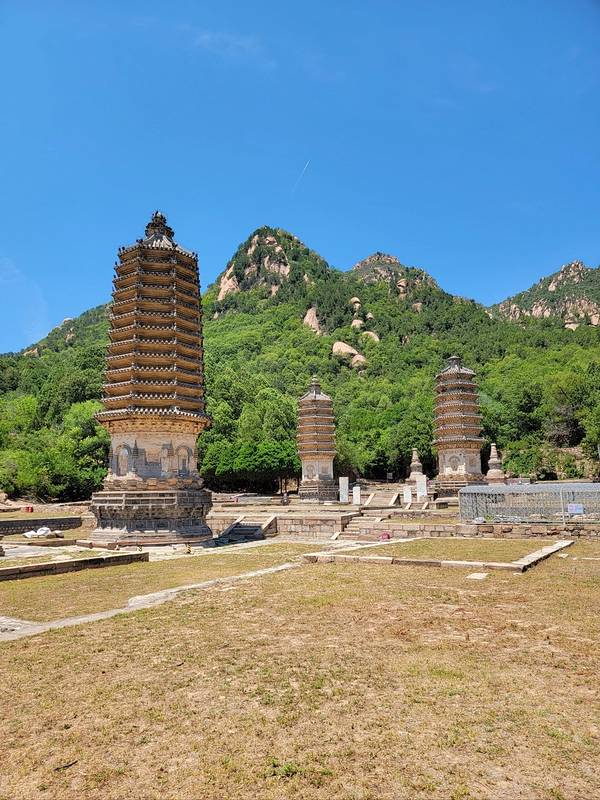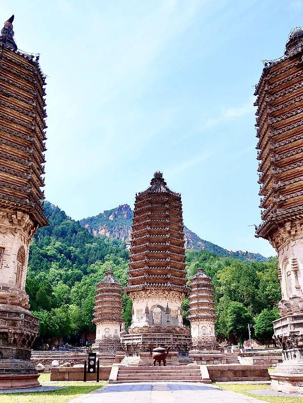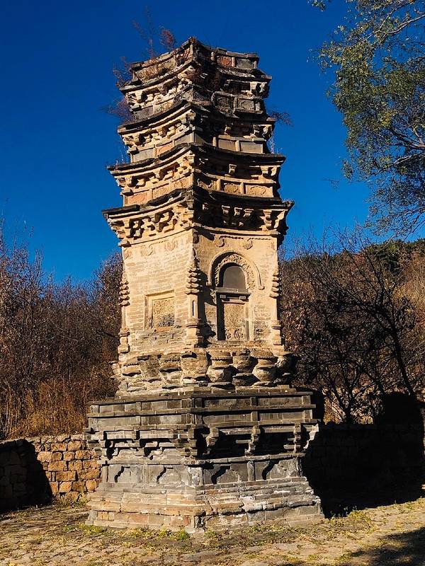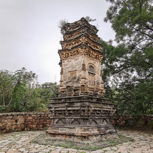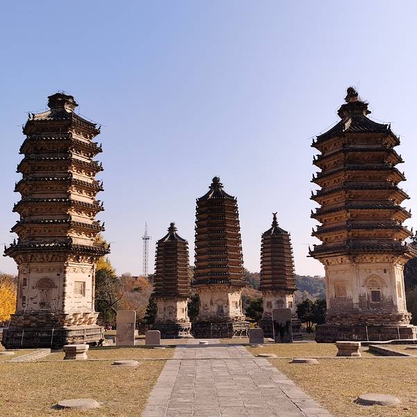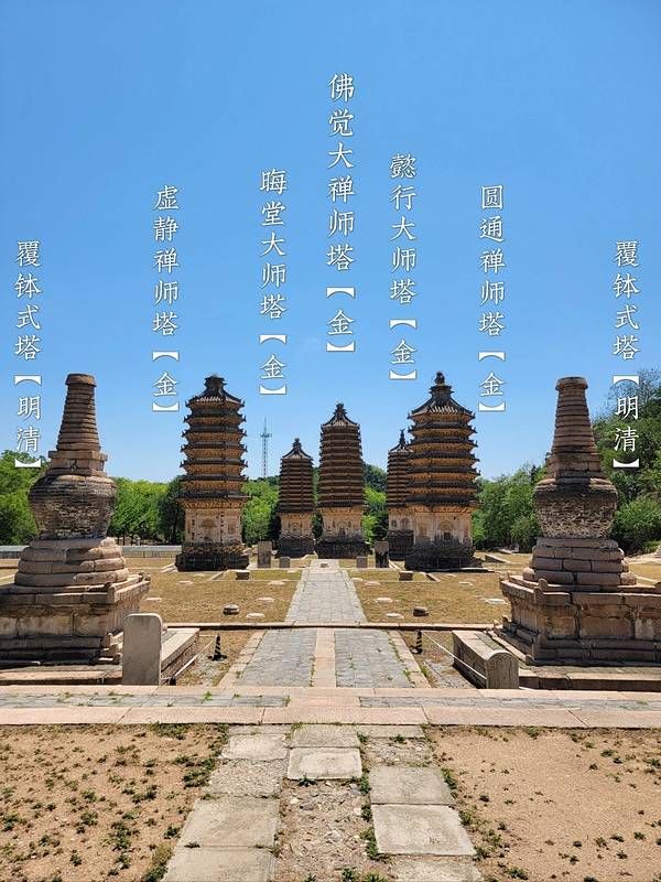 🛤踏入景区入口,穿过一片树丛,5座巨大的金代密檐式塔赫然映入眼帘。这方土地在唐贞观年间始建寺院;金天会年间佛觉大禅师海慧在此潜修并重建庙宇,陆续树立佛塔群,盛极一时。明正统二年(1437),英宗朱祁镇敕赐额“法华禅寺”。1941年,侵华日军进犯八路军北平根据地,寺庙毁于一旦,仅剩如今的地基和地上耸立的7座佛塔。正中最高的佛觉禅师塔塔高22.8米;造型最精美、保存状况最好的是西南角的懿行大师塔,是典型的金代作品。山体各处错落分布着其他一些小型佛塔。🎬此外,塔林还是《黄河绝恋》《倚天屠龙记》《箭士柳白猿》等影视剧的取景地。