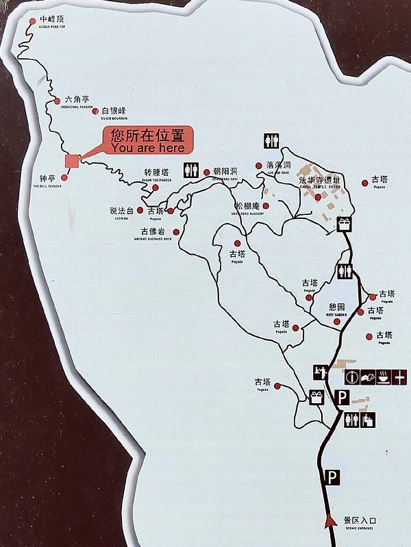 从景区入口到达银山最高峰中顶峰(海拔726.81米)大约需步行2.5km,海拔攀升400m(手表gps测量,可能不准)。从塔林后身上山即可,路线单一,难度不高,上下山+拍照可控在3h内。上山碰到的第一个亭子和峰顶平台均可拍到完整的塔林(p4、p15)。