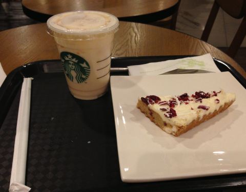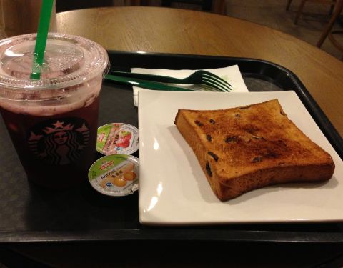 有段时间非常喜欢这家店,因为这是福建省内唯一一家24小时经营的星巴克,可是后来因为夜间经营成本太高就把营业时间改到了23:00.这家店服务态度很棒,有一个男生冲拿铁冲得很好,楼上的空间很大,去看书写论文都很舒服。图中是和朋友聊天时点的一些东西~~很喜欢烤土司和蔓越莓蛋糕啦~