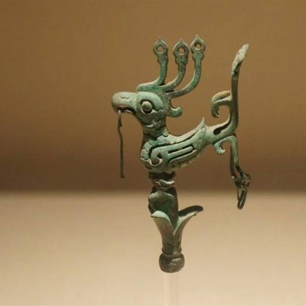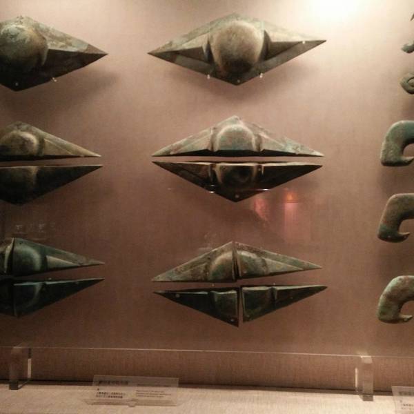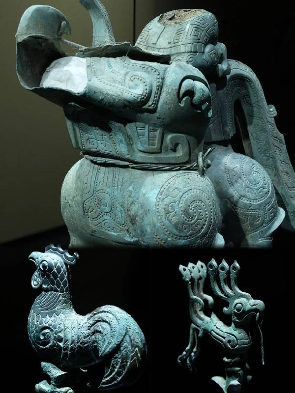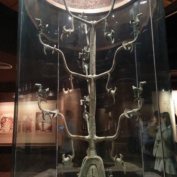 🔘青铜神树:已知同一时期发现的最大的青铜单件物,是中国首批禁止出国展览文物,与“十日神话”(后羿射日)有关。