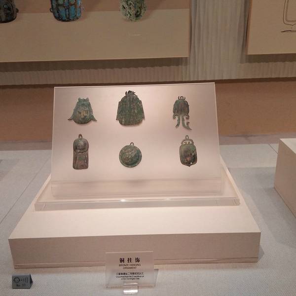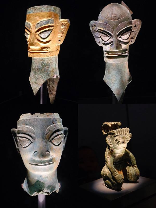 青铜扭头跪坐人像(1F一展区-世纪逐梦)青铜榊树+青铜纵目面具(2F三区天di人榊)青铜太阳形器(2F三展区-天di人榊)