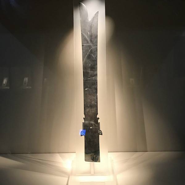 🔘黄金权杖:一号坑出土,1.4米,重500g,含金量85%,是世界上出土的体量最大的金杖。其年代大约在4000年左右,夏朝刚刚建立。该权杖上面雕刻有人、鸟和射鱼的图案。