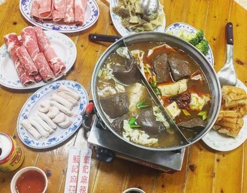 蓝记麻辣火锅开在居民区很接地气经济实惠的麻辣锅,锅底有大块鸭血和豆腐辣而不呛,点了台北人比较爱吃的肥牛,腰花和猪肝,他家的调料很有自己的特色很香。