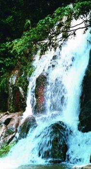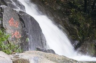《观瀑亭欣赏剑瀑》双龙穿过飞虹桥,倾入剑池三丈高,瞬间凌空扑剑潭,飞流十丈下云霄