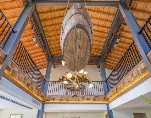 四顶山居整体建筑错落有致,退台式的设计,极大的避免高层房间遮挡底层房间的阳光。尽力让每一件客房都拥有自己的阳台或者露台空间。在这里感受早晨沐浴晨光被自然唤醒的美好,在草坪上美美地用一顿早餐。中午可以享受农家菜肴,体验原汁原味的当地人文风情,享受温暖的家的味道。午后,也可以一书一人一盏茶,悄悄忘记时间。中央会客厅的设计别具一格,结合了巢湖渔船文化和清新原木风,凭借柔和淳厚的质感,与其他亮丽多彩的色调相比,素雅、禅意的原木风气质上更趋于柔和舒缓,使人更亲近大自然,因而更能彰显出一种返璞归真的感觉。