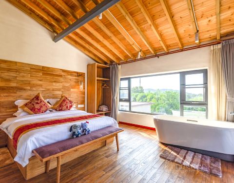 四顶山居整体建筑错落有致,退台式的设计,极大的避免高层房间遮挡底层房间的阳光。尽力让每一件客房都拥有自己的阳台或者露台空间。在这里感受早晨沐浴晨光被自然唤醒的美好,在草坪上美美地用一顿早餐。中午可...