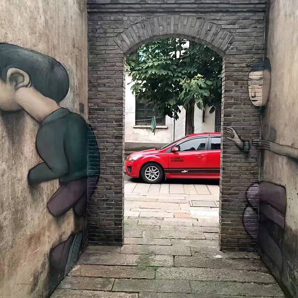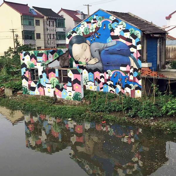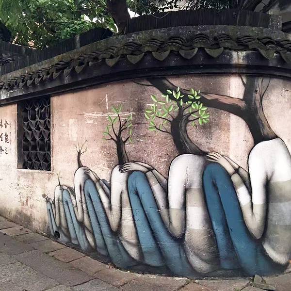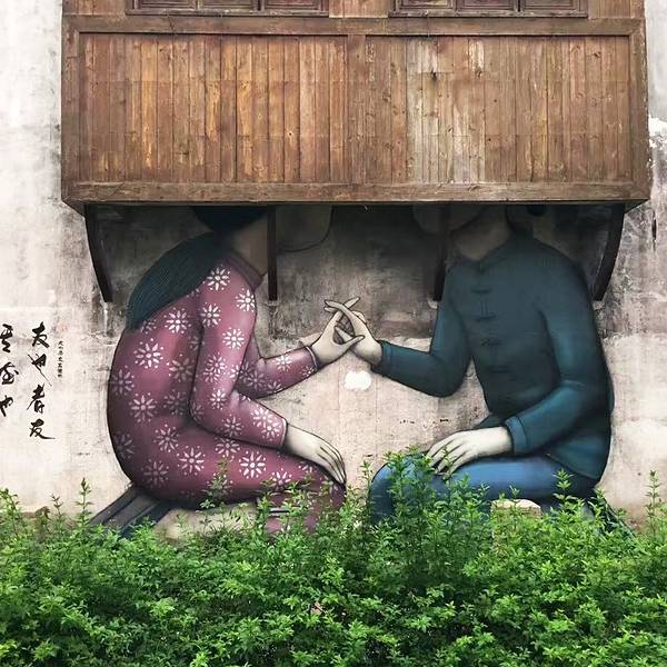 去枫泾当然还要看看柒先生的画,柒先生,法国名字朱利安•马朗(Julien Malland),2015年和2016年两年间,他在上海的枫泾古镇留下了十几幅具有江南水乡特色、中西合璧的涂鸦画,并成为当地旅游的一大热点景观。柒先生把饱经风霜的旧房山墙当画板,把优美别致的窗棂当道具,笔下人物与周边环境巧妙融合,在深巷中、在农庄里,点缀了一方方独特的风情画面。
