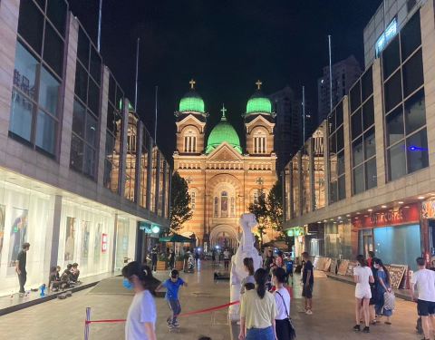 西开教堂边上就是步行街,现在疫情已过又是夏天,吃过晚饭后街上都是散步乘凉的西开教堂边上就是步行街,现在疫情已过又是夏天,吃过晚饭后街上都是散步乘凉的。大多数人都是像我们这样一家一家的,总算有点回到常态的样子。