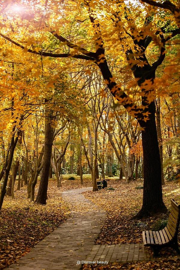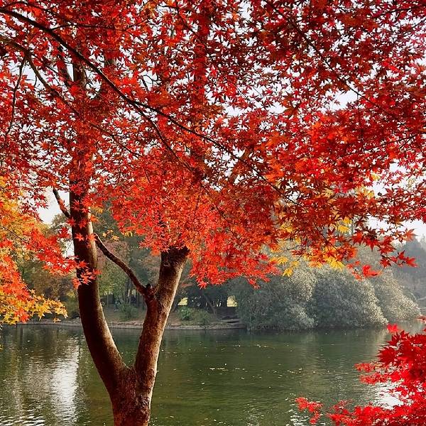 1. 秋天主要欣赏公园的秋林爱晚景区,位于公园的中部偏东北,是盈湖的一个大岛,岛上种植红枫、红叶李、银杏、香樟、火炬树等树木,到了深秋时节各色树叶绚丽多彩,落叶归根,堆积成毯。