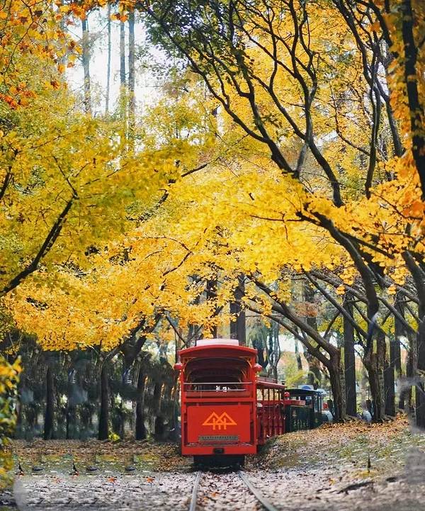 4. 小火车的轨道两侧遍布着落叶和银杏树,满地金黄仿若童话世界,特别适合秋天来拍照。