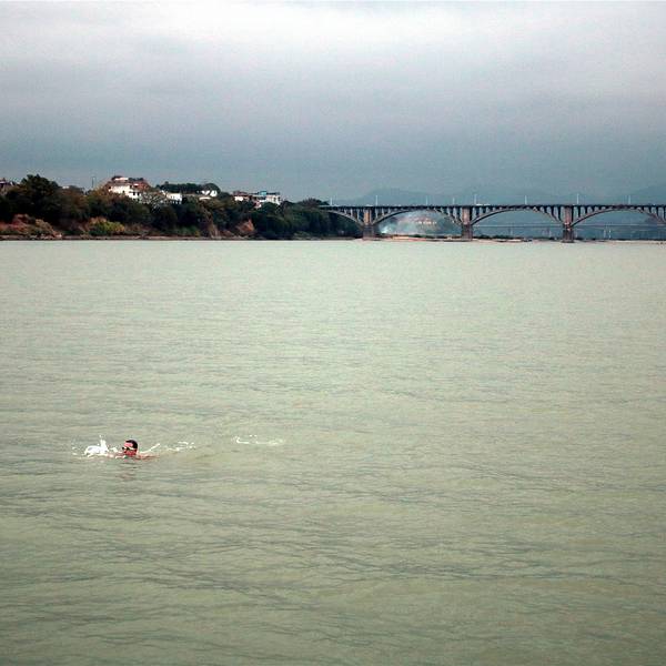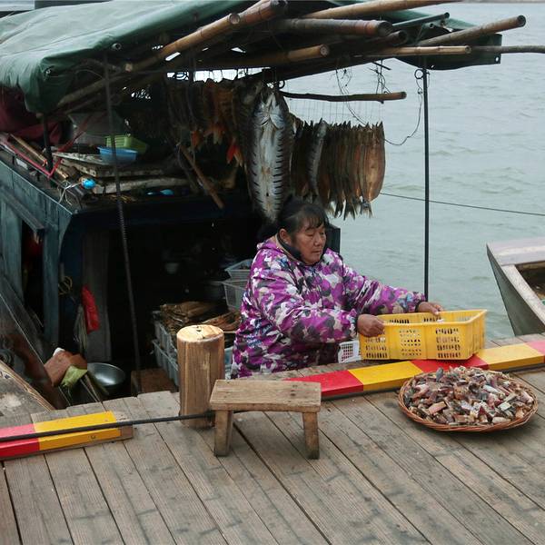浮桥长约400米,由100多只小舟板并束之以缆绳相联而成,始建于宋乾道年间(1163--1173)、至今已有800多年历史。浮桥边的渔家。