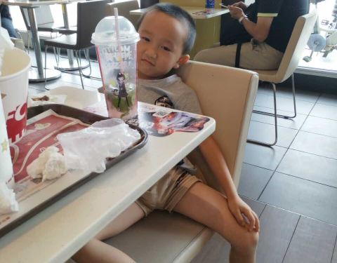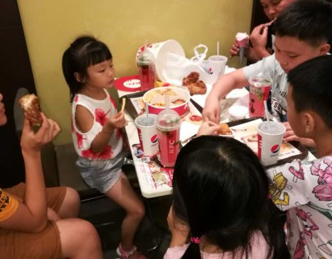 开开心心一群小孩子吃得津津有味,吃饱准备直落看电影了,钱呀