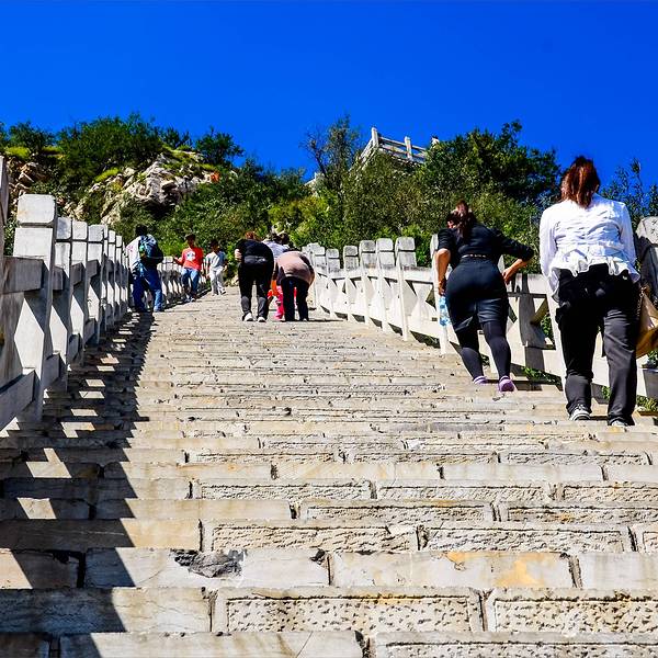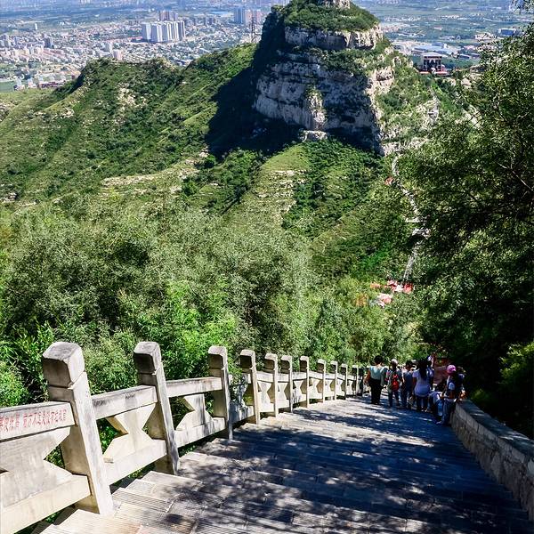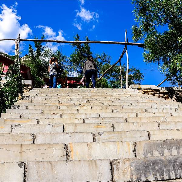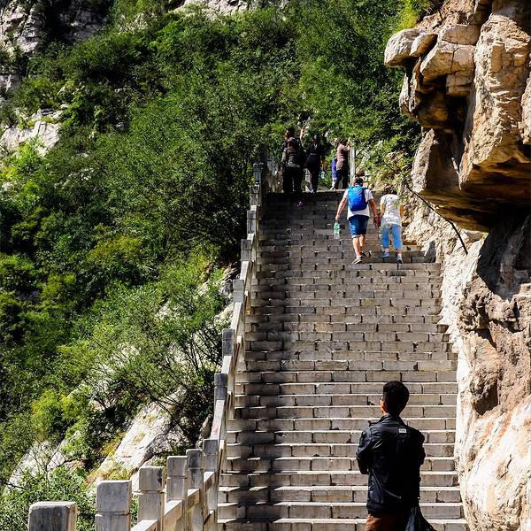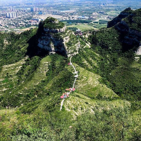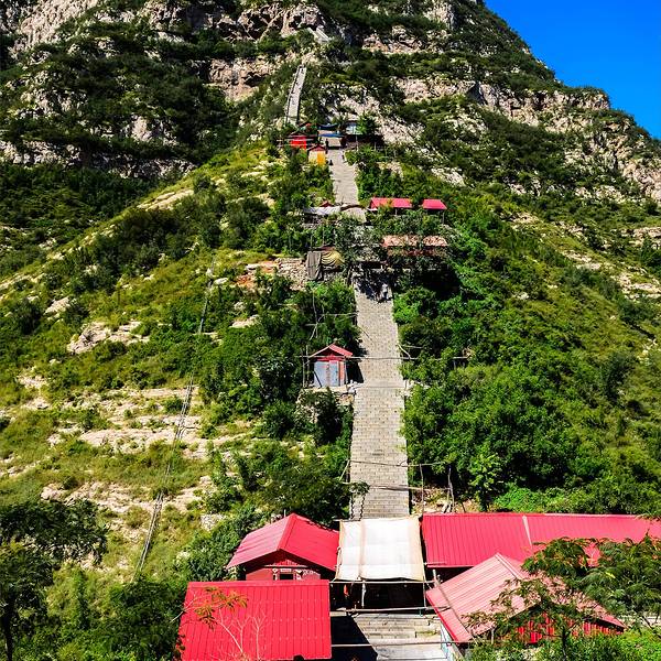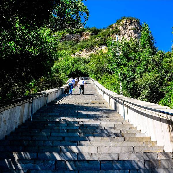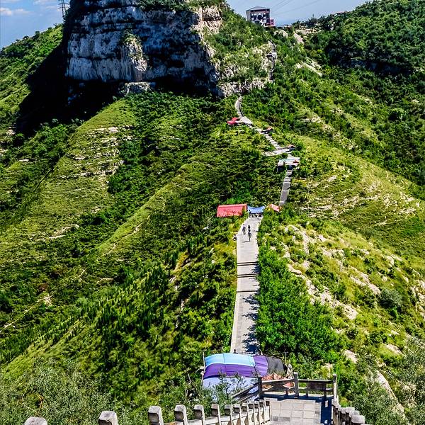↓ ↓从石家庄驱车,几十分钟便到达景区。抱犊寨的登山道,广受好评,它全是石阶,并且不用走回头路。标志牌明显示示:全长3300M,海拔580M,台阶3086级(北京香山的台阶是2200级) 展开