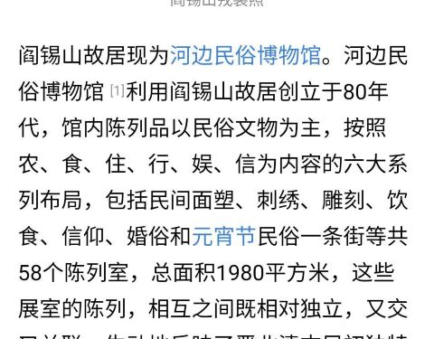 河边民俗博物馆是在闫锡山故居上改造扩建的,位于忻州市定襄县城东北约20公里处,重个建筑反映了晋...河边民俗博物馆是在闫锡山故居上改造扩建的,位于忻州市定襄县城东北约20公里处,重个建筑反映了晋北清末民初的建筑风格,也是山西"土皇帝″闫锡山的故居,博物馆内看点多多,历史价值很高,值得一去参观。