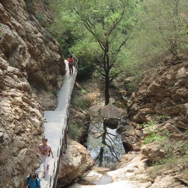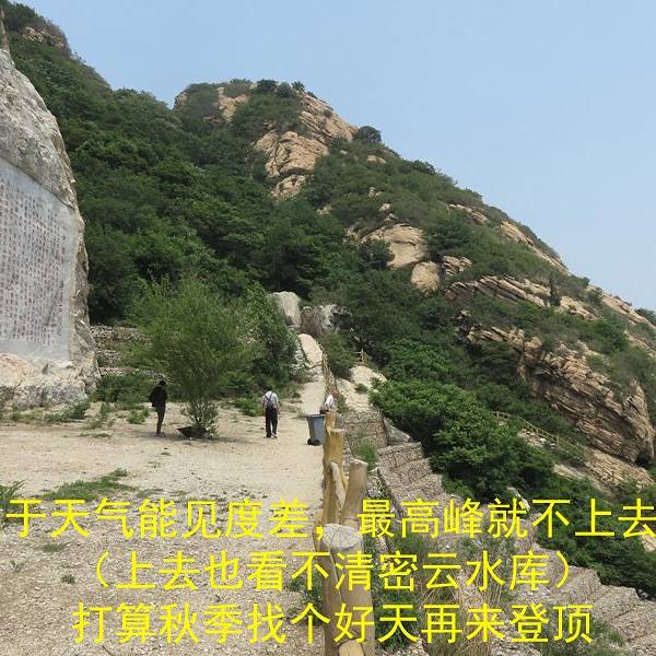 人在林中走,不见蓝天色。这里有野生山核桃、桑葚、山杏、山桃、山花椒等植物;怀古揽胜区内有老道洞、小道房、石碾、石磨、摩崖石刻、古菜窑、明长城,使人仿佛来到世处桃源,脱离人间凡事。站在观云台上城城镇镇尽收眼底,密云水库一览无余;万里长城龙飞凤舞,蜿蜒曲折离你而去,使人浮想联翩,流连忘返。
