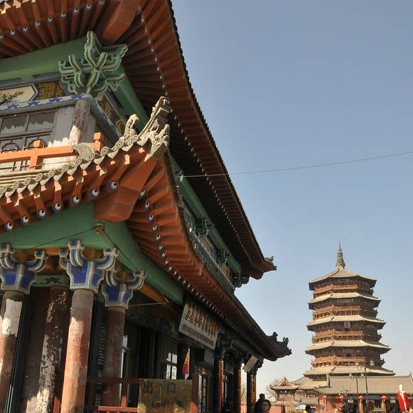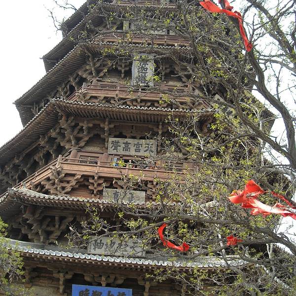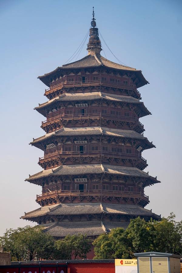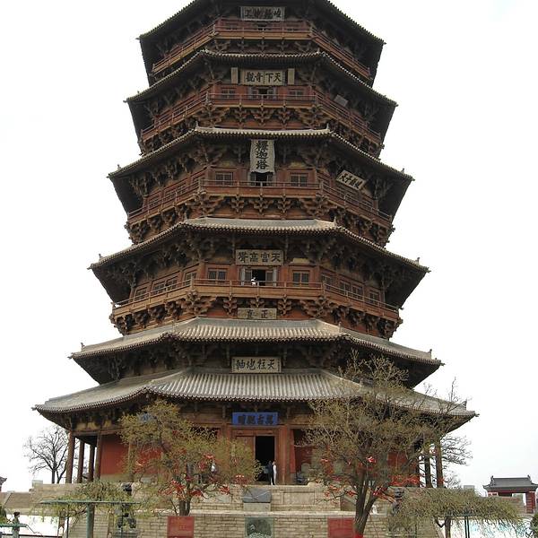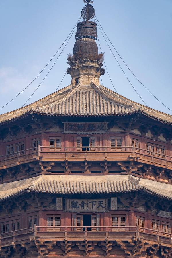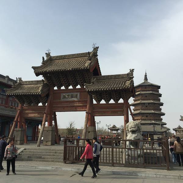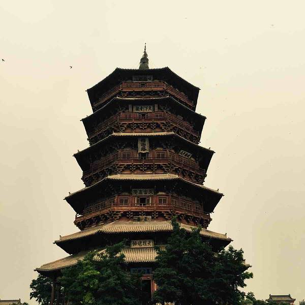 稀有的辽代古建筑,是我国现存最高最古老的木塔,建筑中没有用一根铁钉。 在第一层内,有高达11米的释迦摩尼佛像,还有色彩鲜艳的壁画。 塔上有明代两位皇帝亲自题写的匾额:“峻极神功”和“天下奇观”。