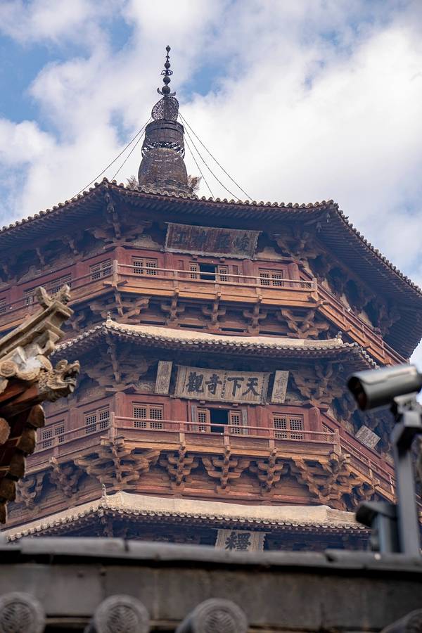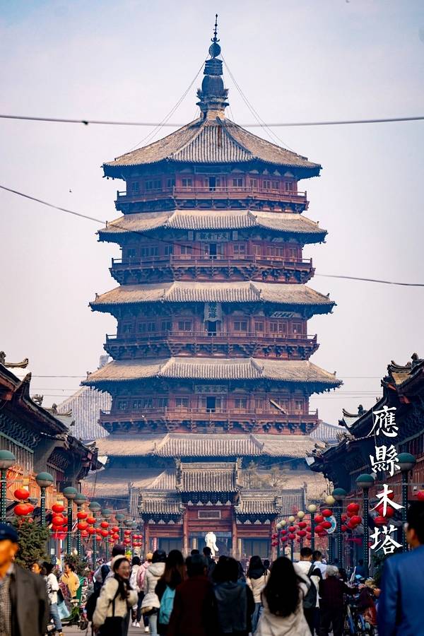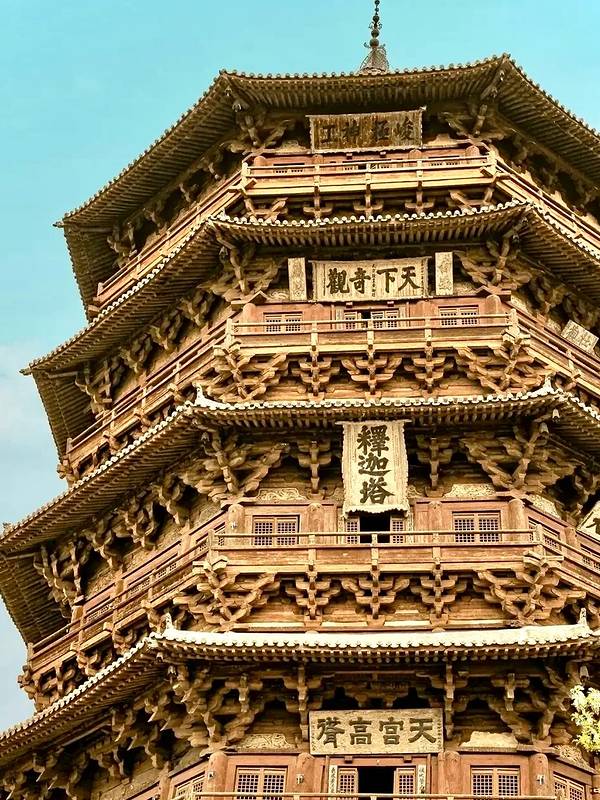 🌟木塔全称佛宫释迦塔,创建于辽清宁二年(1056),此后历代均有修葺。释迦塔是腰缠平座楼阁式套筒结构木塔,六重檐八角攒尖顶,底层直径30米,通高67.31米。塔身外观五层,实为九层,每明层之间的平座暗层起到完美的力学支撑作用,也是木塔屹立千年不倒的秘诀之一