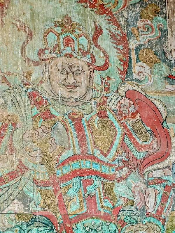 释迦佛像周围分别绘有飞天、天王、门神等形象。南北门两侧绘制的是金代四天王像,上半部是辽代天王像的原作。壁面中的天王怒目圆睁,威武雄壮。由于金代重绘壁画时,将辽代的画覆盖在了下边形成了“画中有画”。