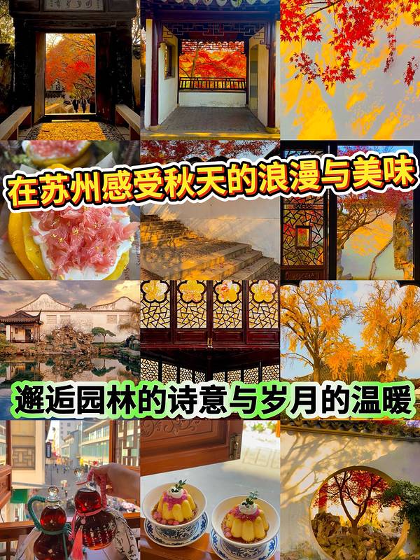 在苏州感受秋天的浪漫与美味,邂逅园林的诗意与岁月的温暖苏州的秋天,就像一幅生动的画卷,绽放出绚丽的色彩✨。这里的园林在秋冬季节仿佛有了灵动的生命,特别是在下午,阳光透过蓝天洒进园中,斑斓的光影交织,仿佛为每一处留下一笔诗意的美学🖌️。