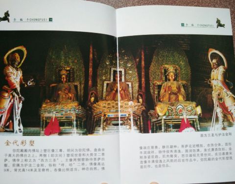 今年七月底去的,朔州火车站旁坐6路公交车,玉百商贸站下车走不远就到了。寺附近还有一长截土城墙。 崇福寺是全国三大辽金佛寺之一,主殿弥陀殿是金代建筑,它的彩塑、壁画、棂窗、匾额、琉璃饰称为“五绝”。弥陀殿面宽七间,进深四间,走入里面,觉得真的好大。殿内佛坛上巨大塑像及巨大背光,像高9米,背光高14米,让人震撼。(所附的图是我买的崇福寺介绍一书中的)