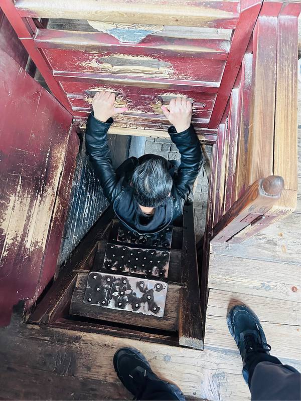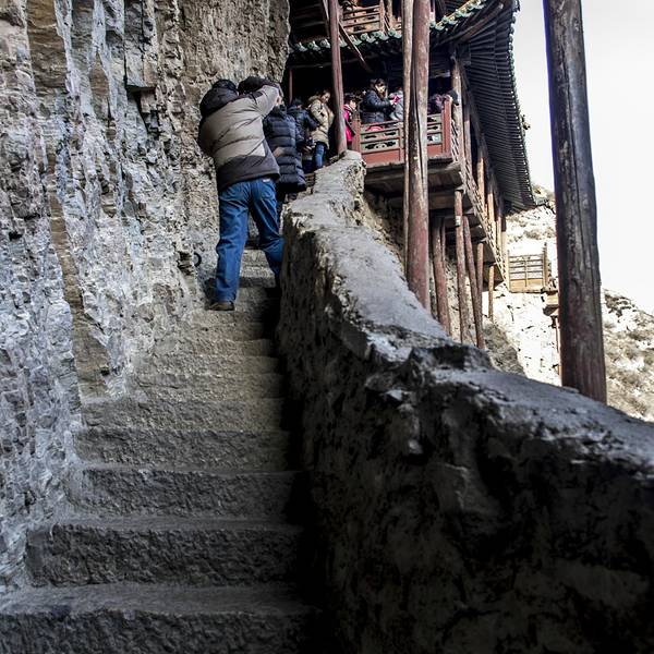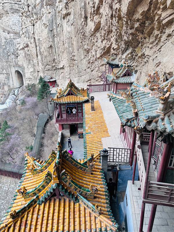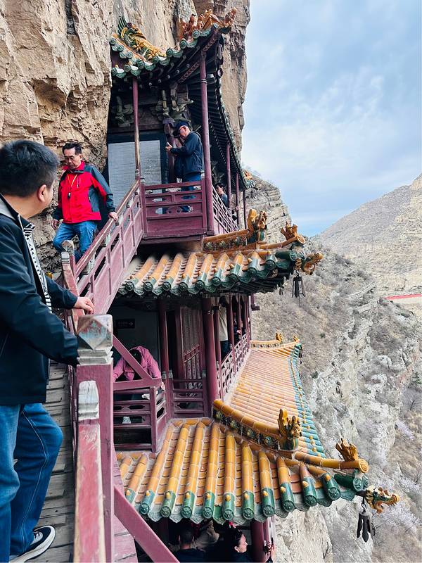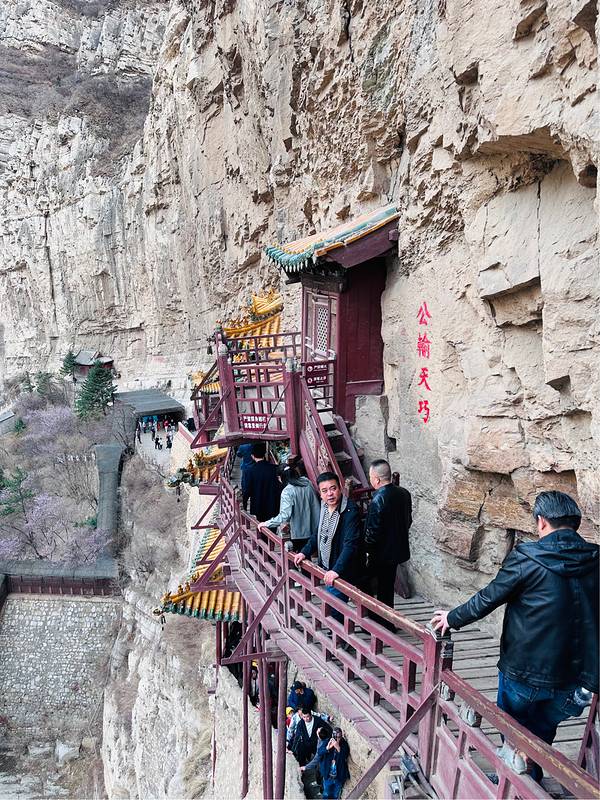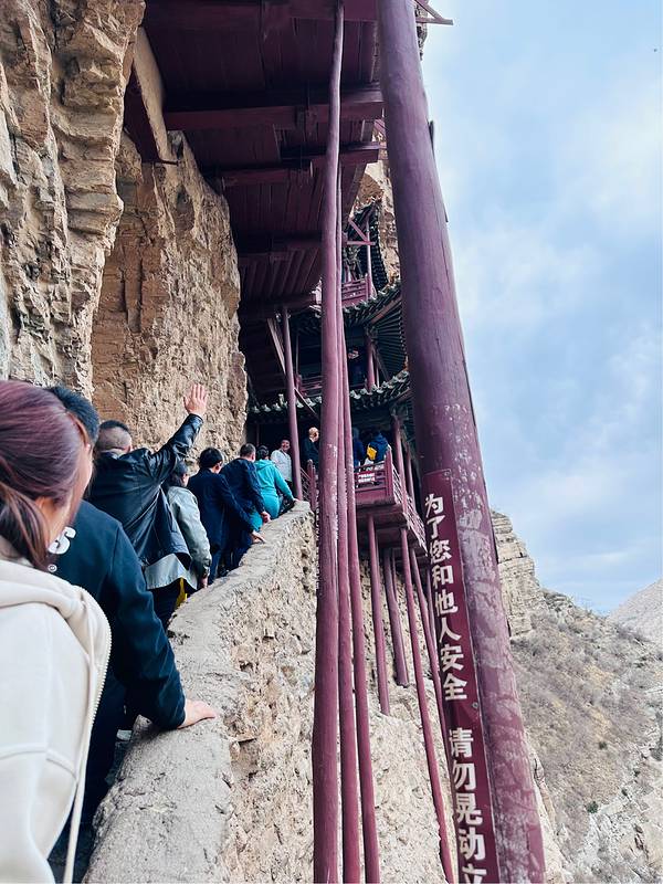 我们大老远来肯定是要登上悬空寺的,看着虽然高,但其实攀爬并不会很累,只是阶梯是很窄很陡,从寺庙底层往高层攀爬的时候🪜,真的是要手脚并用。另外一个比较险的是寺庙的防护栏真的很矮,所以游览过程中一定要注意安全。