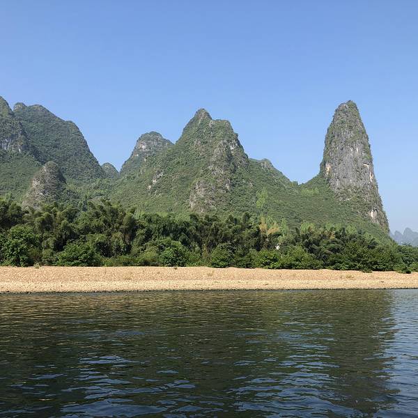 漓江非常长,漓江的游览方式有两种,一种是乘坐电动竹筏,一个竹筏上可以坐4名游客;另一种方式是乘坐三星游轮,乘坐游船游览漓江。我比较倾向于乘坐电动竹筏,更加有意境。大概8点30分左右,杨堤码头的竹筏才正式接待游客。从杨堤到九马画山,竹筏大概需要行驶40分钟左右的时间。有些人当地人会说,游览漓江,最好是有一点阴雨的天气,漓江的烟雨景色更为迷人。我们去的当天晴空万里,景色同样迷人,气温也很舒适,游览的时候身心得到了放松。竹筏在漓江中行驶,前后都会保持一定的距离,可能也是为了安全吧。游览漓江,精华段就是在杨堤到兴坪古镇那段,可以看到黄布倒影、九马画山等景色,我觉得九马画山的景色比较壮观,这就是桂林特有的地貌特征。终点站是九马画山,到岸边后,可以乘坐景区的小交通前往兴坪古镇,人满发车,游客人数少的情况下,20分钟发车一次。