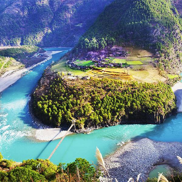 丙中洛村中一条马路,两边有些新建筑,都是客栈饭馆超市等。两边高山上白雪覆盖,沿山坡一直到江边有农舍,庄田,油菜花、桃花盛开着,配上碧兰的江水,仙境一般呀!奔波一天半的时间,看到如此美景,定会让你心情大好!沿马路向班车进村的方向走路20分钟就是桃花岛观景台,一个非常合适的观景位置,下面是桃花岛,28户人家,花开花落,出耕牧归,幽然无限。一条铁索桥通向江外。向左看是丙中洛村的山坡,田野,农舍,粉花绿地,远处的雪山云雾缭绕,好一个赏心悦目的所在,清新的阳光洒在岛上,蓝蓝的江水无比娇艳。左边的丙中洛乡也是美妙无比,眼前美仑闰奂的景色。从丙中洛再向峡谷纵深,有景点:重丁村-石门关-四季桶村-雾里桶村-茶马古道-秋那桶村-那恰洛峡谷。每个小村子那些棕褐色的木屋,天使般静静地躺在雪山脚下,充满着古朴傈僳族村落的风情,不时可见到身穿民族服装的姑娘赶着牛马在青棵田中走过,真如一幅幅绝美的风情画卷。从丙中洛村向峡谷外不到半小时车程就是著名的怒江第一弯。实用攻略及旅游TIPS: