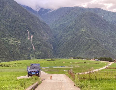 丙中洛村中一条马路,两边有些新建筑,都是客栈饭馆超市等。两边高山上白雪覆盖,沿山坡一直到江边有农舍,庄田,油菜花...丙中洛是怒江峡谷中最大的村落,班车的最后一个停靠站,游客大多下榻这里,吃住行均方便。