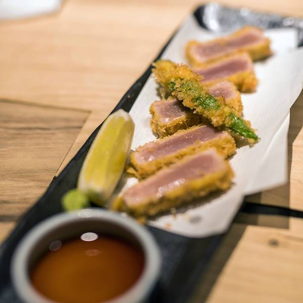 网红店固然等位的人不少,还好我们有提前预订,才能以最快的速度就餐。首先上来的是配菜,秘制的猪肉,类似我们的红烧做法,但没有那么油腻。接着是炸金枪鱼排,以我的认知是金枪鱼,哈哈也不一定对哦,毕竟语言不通,我只能看图点餐了。虽然外面炸的金黄,但内里的鱼肉还是像刺身一样新鲜。先是一口脆,再是一口软,口感十分微妙。接着又是一种肉,凭口感是鸭胸脯肉。保持了肉的原汁原味,并没有加太多的佐料,而搭配旁边的酱汁,蘸一点提味,才是正确的吃法。碳烤猪颈肉,没猜错的话应该是刷了蜜糖,所以很好吃。日式煎饺,皮薄、焦脆,来双份都不够吃。最后登场的拉面是重头戏。拉面有味增和辣的2种,汤底非常鲜。面的口感很软,臀肉看似油腻,吃起来却还好,不油也不柴,刚刚好。当然还少不了日式水煮蛋,也就是我们所说的溏心鸡蛋。