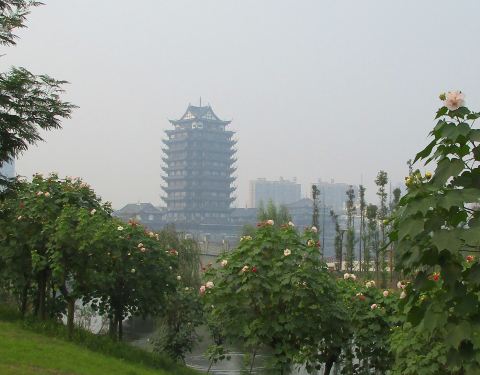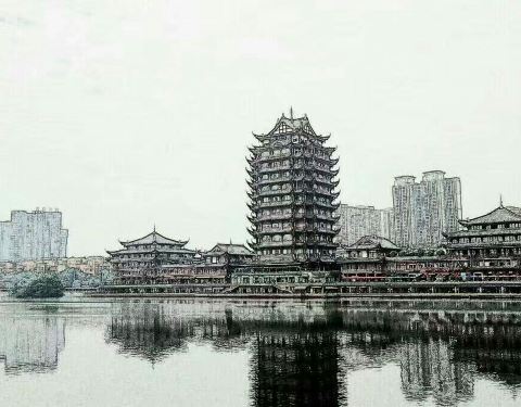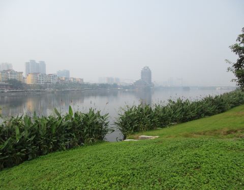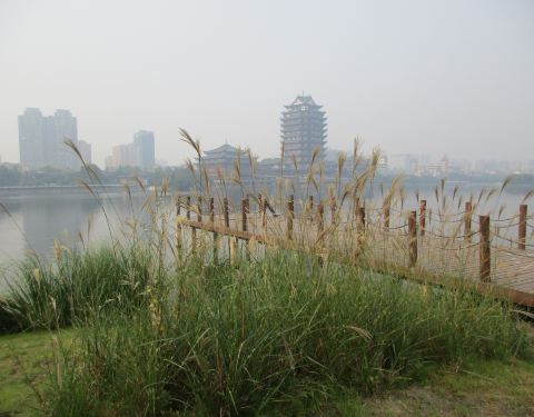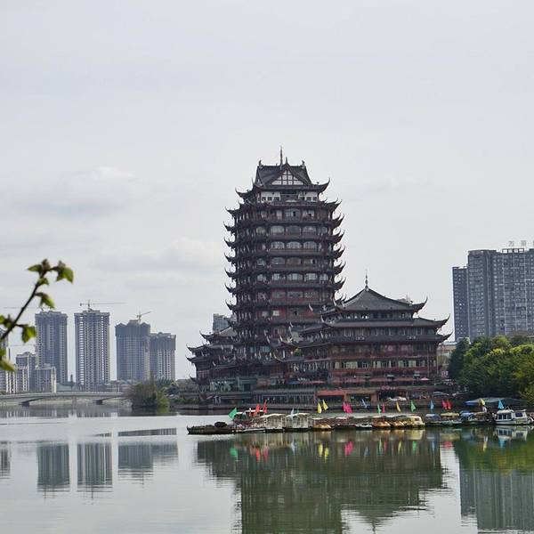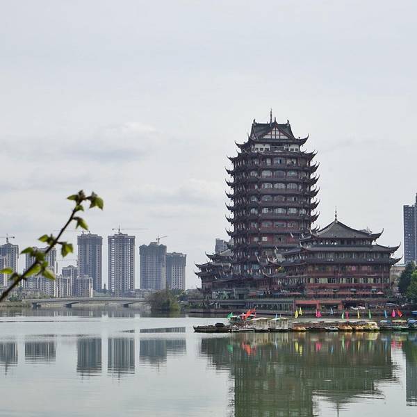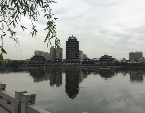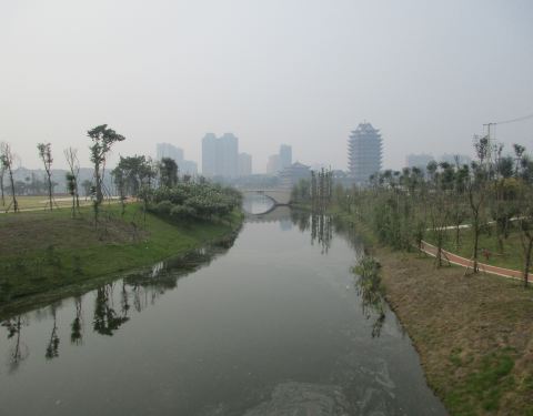 这个公园的全称叫东坡城市湿地公园。公园面积很大,我们2015年去的时候除了靠东坡湖的景观还不错,坡地草坪和树木还未形成景观,所以总体只能算一般吧。不少地图上搜不到这个公园,估计是建成时间较短的缘故吧。现在可能会好很多了。《眉山远景楼记》是苏轼的作品。这篇文章是公元1084年,在远景楼创建之初,苏轼应当时眉州知州之约为家乡这座名楼所作的记。文章表达了作者的美好的社会理想与愿望。湿地公园对岸就是2004年重建的远景楼,据说是目前全国最高大的仿古建筑群之一,也成为公园景观的组成部分了。