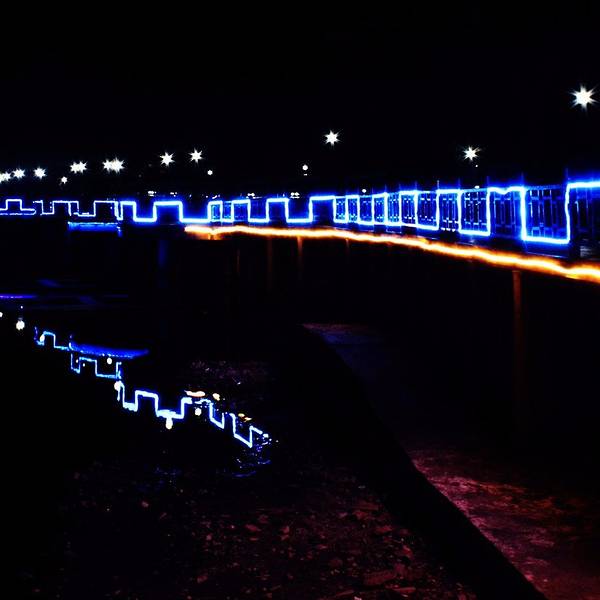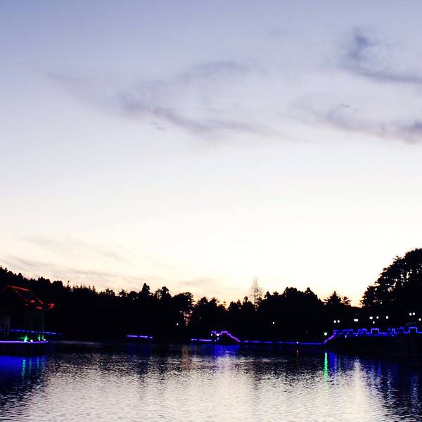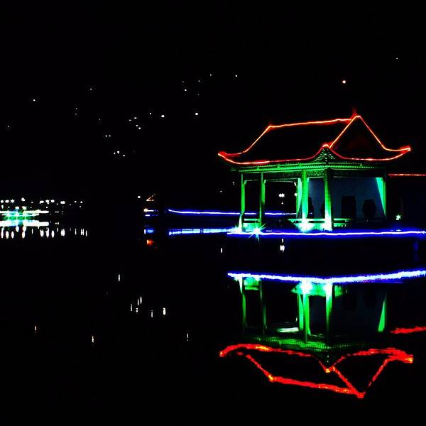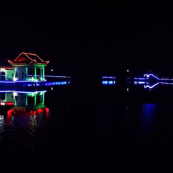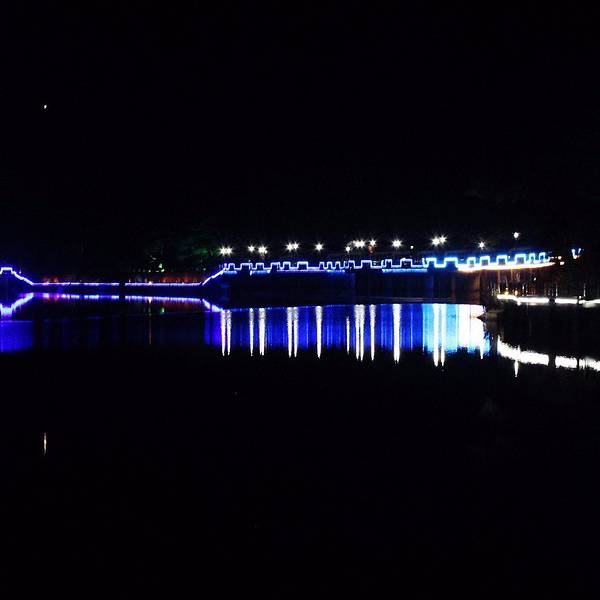 第一天晚上入宿大自然,听说如琴湖就在附近,十来分钟就能到。叫上做义工的妹纸做导游,穿过小巷子就看到银带灯河的如琴湖了。