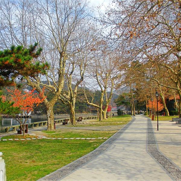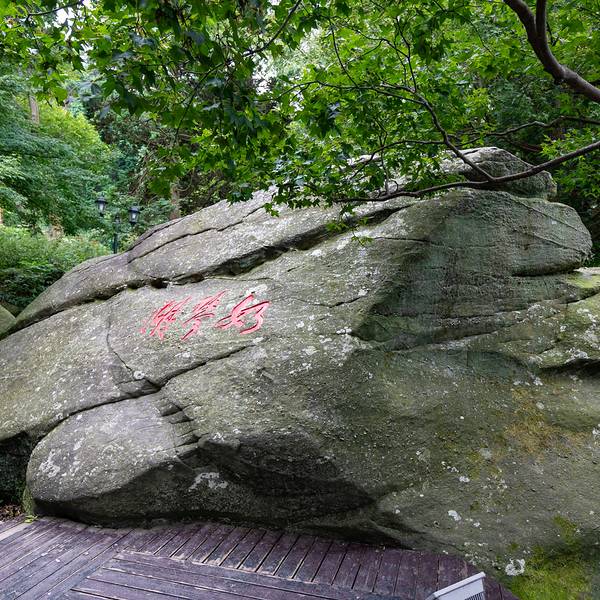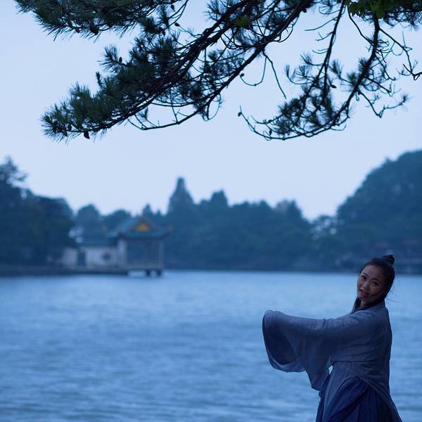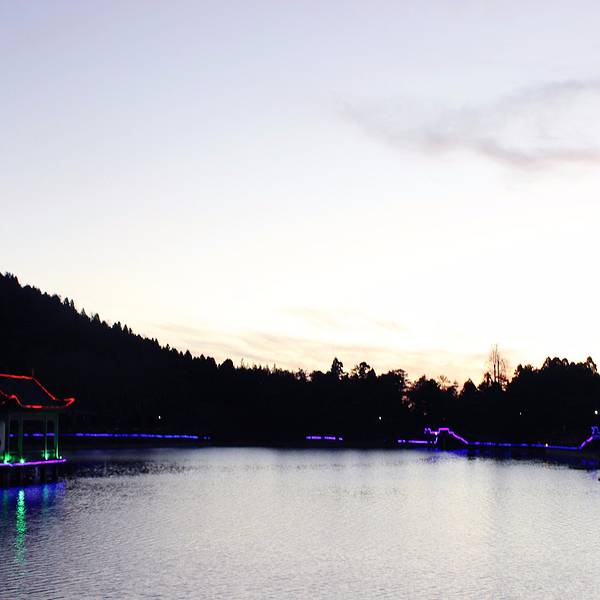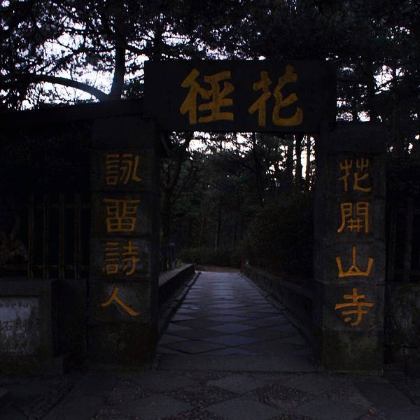 天空渐渐暗了下来,如果说夜晚的如琴湖是银色的,中午是蓝色的,那么傍晚应该是紫色的,如同蒙着薄薄的轻纱,灯光初上下映照得湖水更幽深静谧。如琴湖旁边是花径,又因湖傍花径,故称花径湖。湖中有湖心岛,呈椭圆形。岛上有九曲桥与湖岸相连。因为白居易的“人间四月芳菲尽,山寺桃花始盛开”更名满天下。对面是锦绣谷,锦绣谷连着仙人洞, 展开